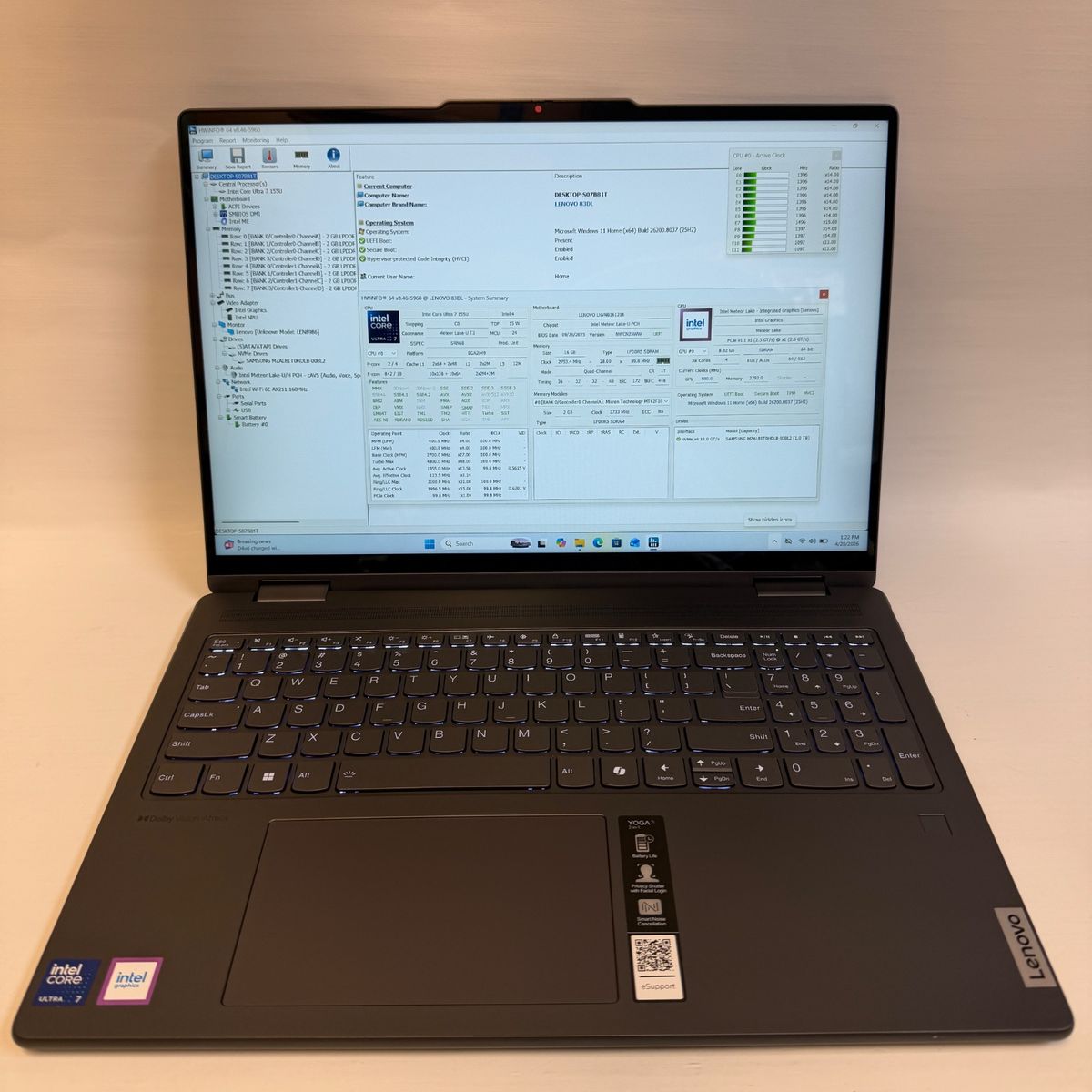 Powered by the Intel Core Ultra 7 155U processor, this system offers efficient performance with improved AI capabilities and integrated graphics for smooth daily use. With 16GB of memory and a fast 1TB SSD, it ensures quick boot times and ample storage. Sleek, lightweight, and versatile, the Yoga 7i is well suited for professionals, students, and power users.