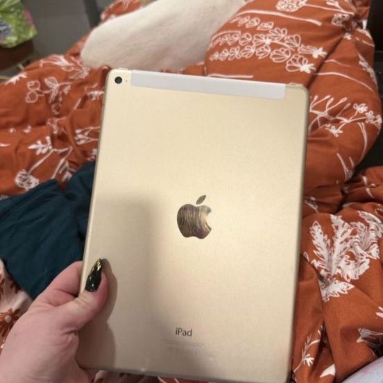 ApplePayGold Apple iPad has white front bezel and cellular antenna band. Device is finished in gold aluminum with 9.7 inch display and home button. It has 64 gbs!