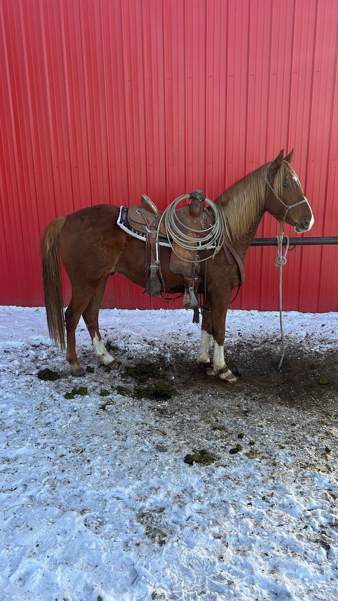 Started ranch horse, can go any direction. Too small for me. Still a project, been rode outside checking cows and tagging calves. Can swing a rope on him. Grade horse. Open to trades and offers.