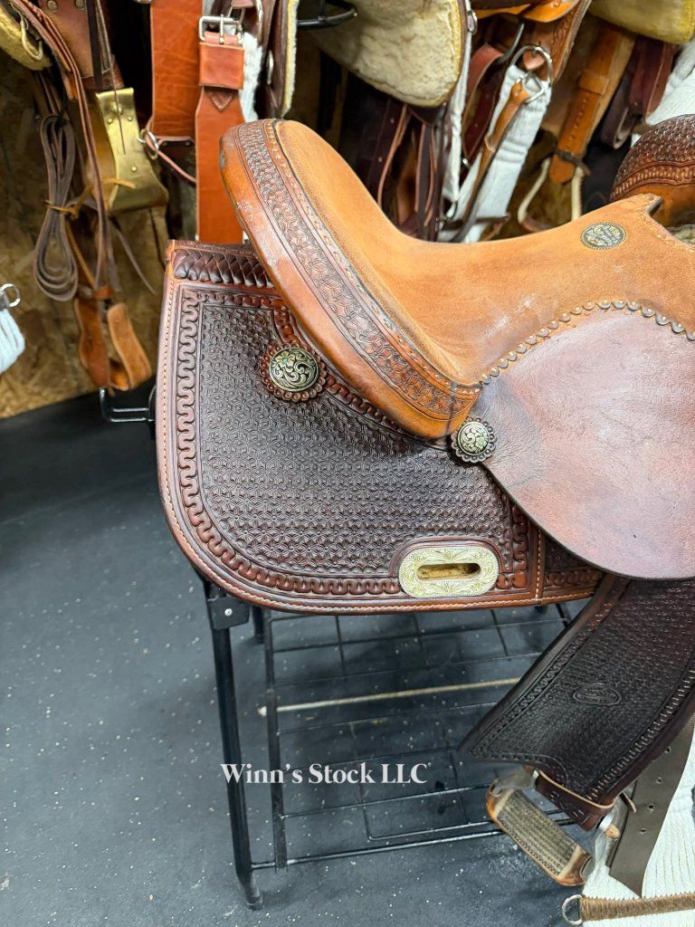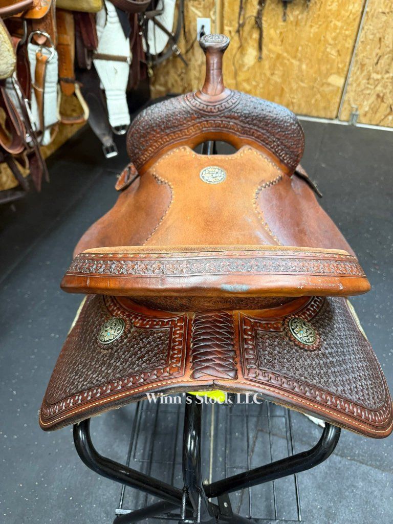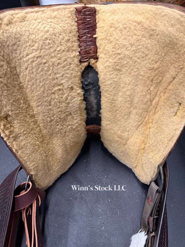 This saddle features a 14" padded suede seat, 4 1/2" cantle, 6 3/4" gullet, FQH bars, in-skirt rigging, angled aluminum stirrups, off billet, new front cinch, new latigo, fleece is really good, and weight is around 25lbs.
