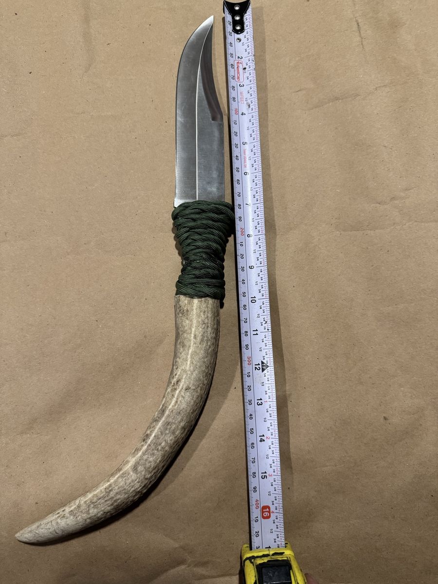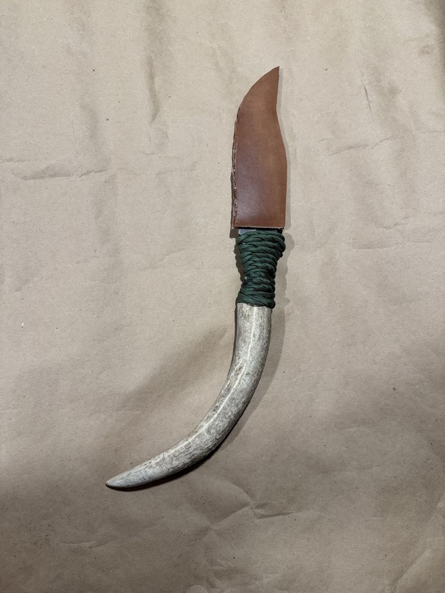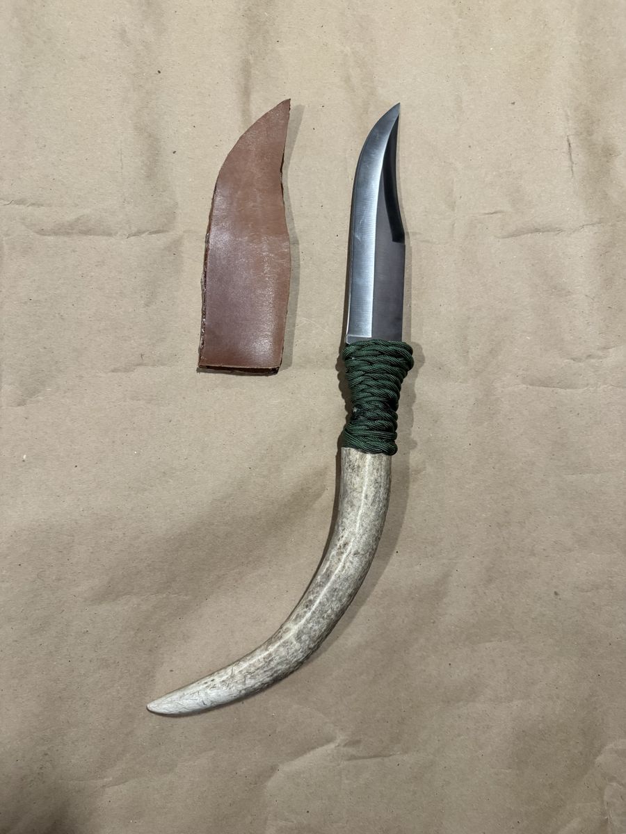 Massive knife. Hybrid antler hilt with paracord wrap for grip. Dimensions are in pics. Leather cover.