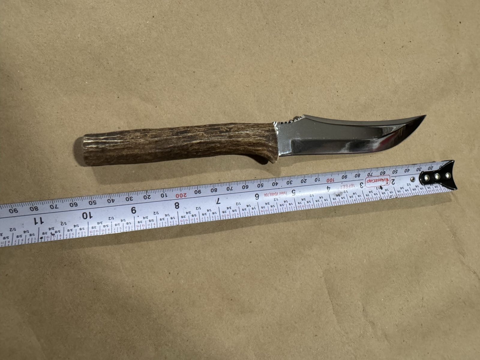 5in blade, 10in overall. Hand made. Highest quality components. Razor sharp. Brand new, genuine leather cover with authentic antler hilt.