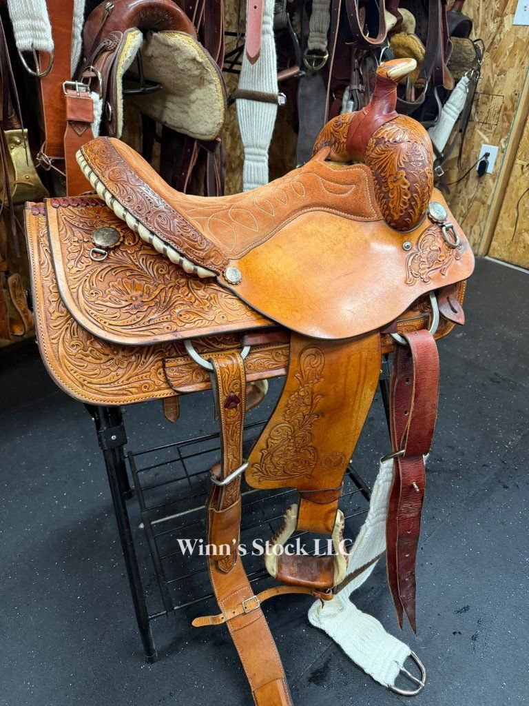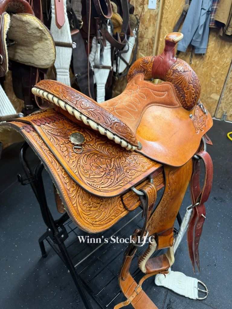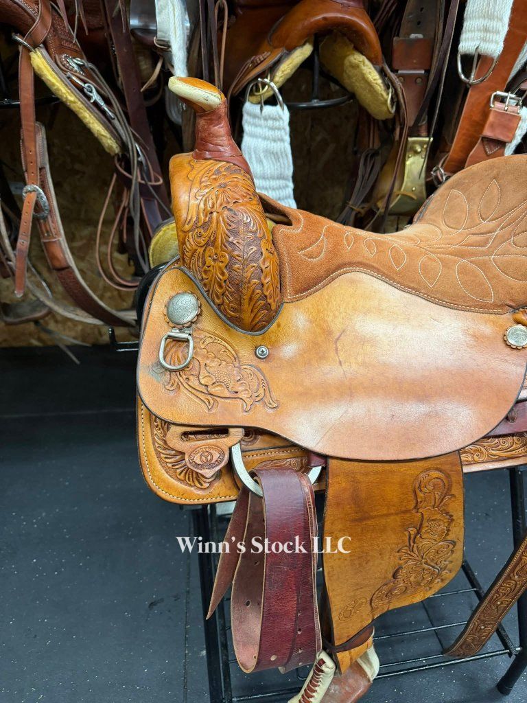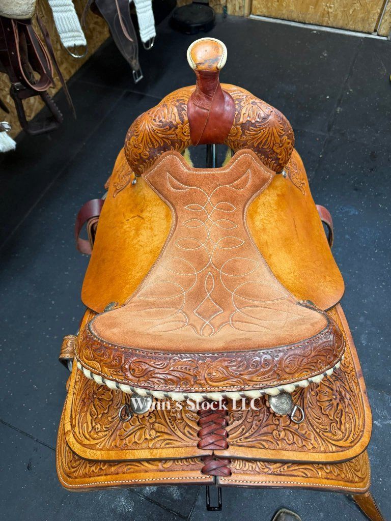 This saddle features a 15.5" padded suede seat, 6 3/4" gullet, SQH bars, dees on back conchos for leather ties if needed, stainless rigging, rawhide wrapped stirrups, fleece is good, and weight is around 35lbs.