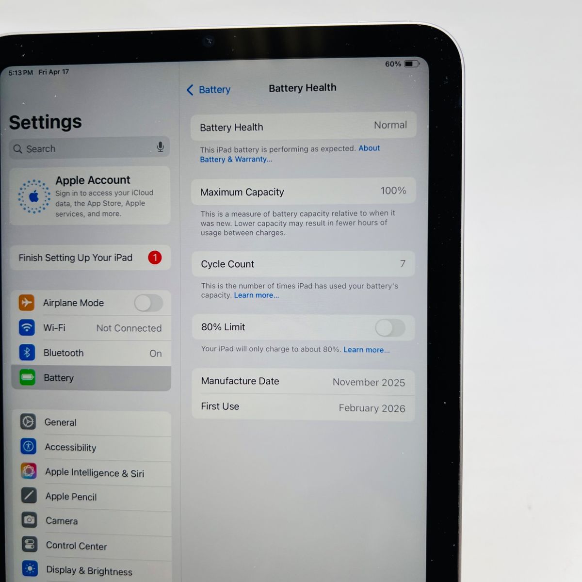ZelleSKU#30251- Cycle count at just 7. Still under Apple Warranty (2027/02/06). This tablet is in like new condition