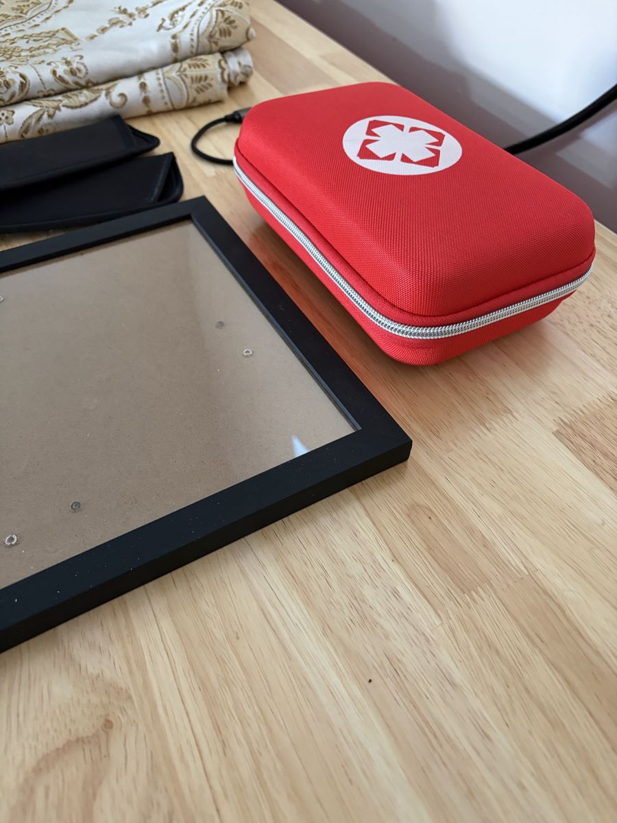 1 first aid kit (unused); 10 x 12” picture frame w/ glass; 6” USB / USB-C cable; 2 new glasses sleeves; 1 golden table cloth (for rectangular table seating 6-8 people); everything’s in flawless condition; everything must go at once
