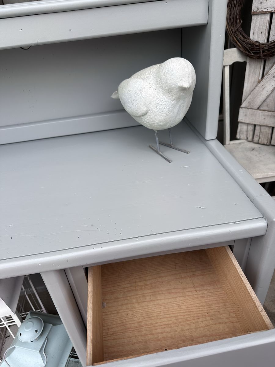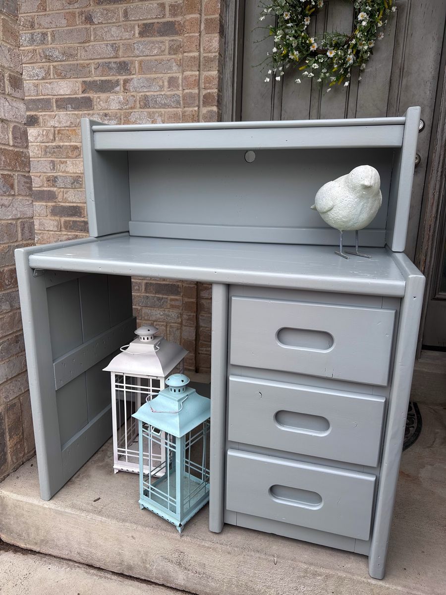 VenmoFOR SALE: Light Gray Desk with Hutch - Perfect Farmhouse Piece! Price: $250 OBO Beautiful JUST refinished light gray painted desk with matching hutch! This versatile piece is great for a home office, entryway, craft space, or even as a vanity. It has a spacious desktop, a generous hutch for storage/display, and three deep drawers on the right side for plenty of organization. Dimensions: • 40 inches wide • 40 inches tall (overall) It comes in two pieces (hutch lifts off the base for easy moving/transport). Solid construction and freshly painted in a soft, neutral light gray that goes with almost any decor. Currently ready for its new home! Local pickup only in Genola, UT. Message me with any questions or to schedule a time to see it. Cash or Venmo accepted. First come, first served! #furniture #deskhutch #farmhousedecor #homeoffice #utah