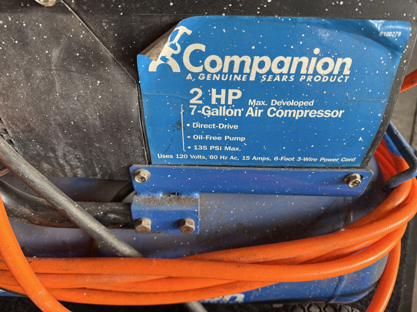 2HP compressor. Used in my shop to air up tires and air clean/dry parts. Works great. It has the nozzles, hoses, and an extra 7 gallon spare tank. Real good quality works great.