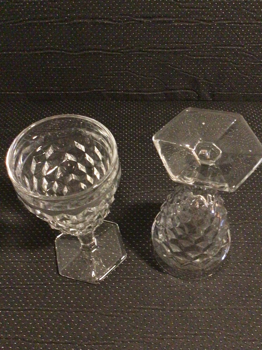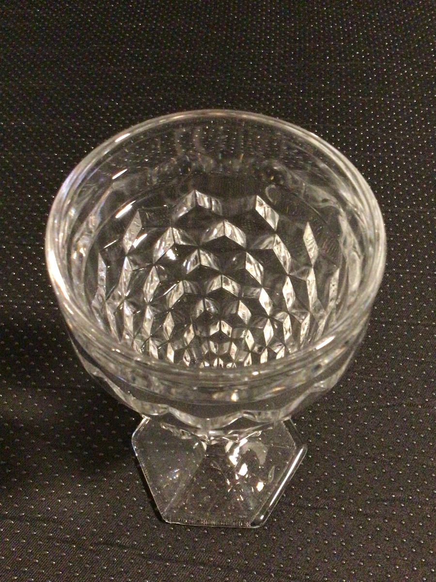This listing is for a clear glass water goblet with a hex base made by Fostoria, American, about 6 7/8” tall, in excellent condition, 10 available.