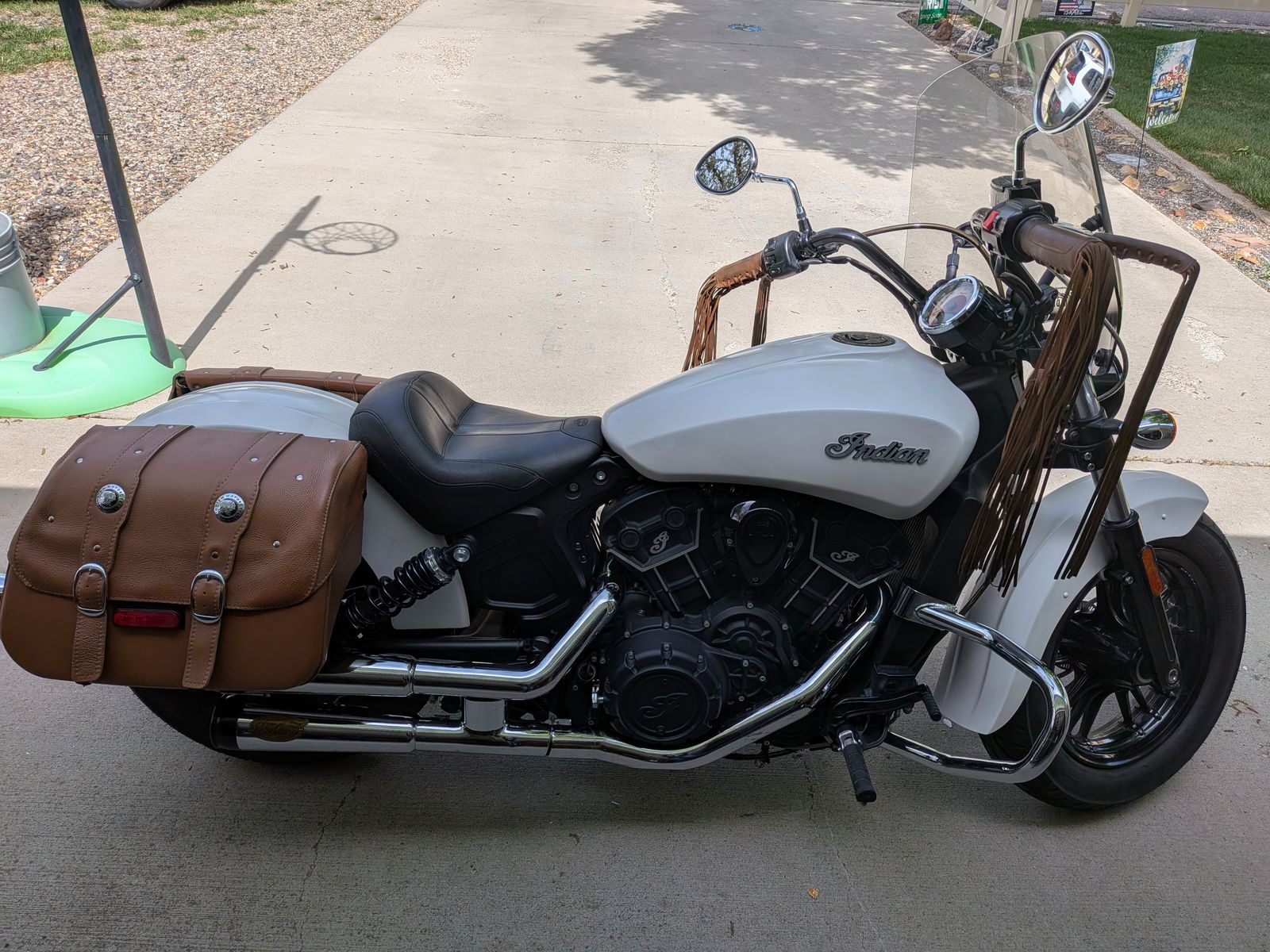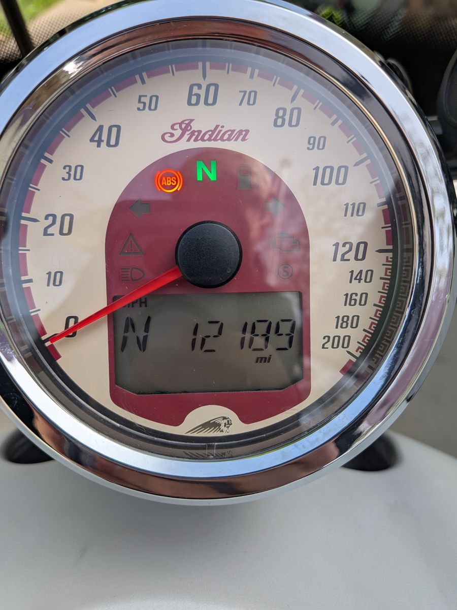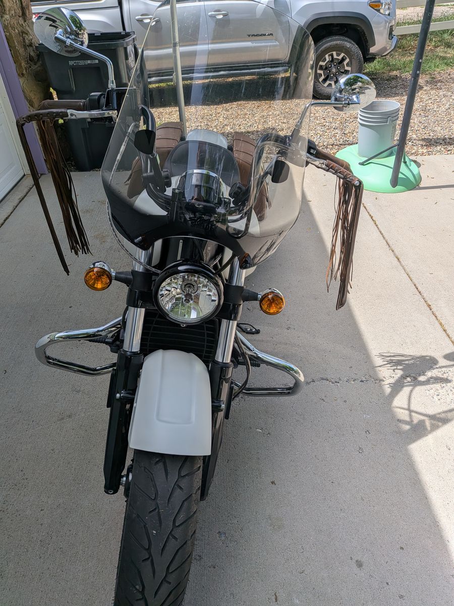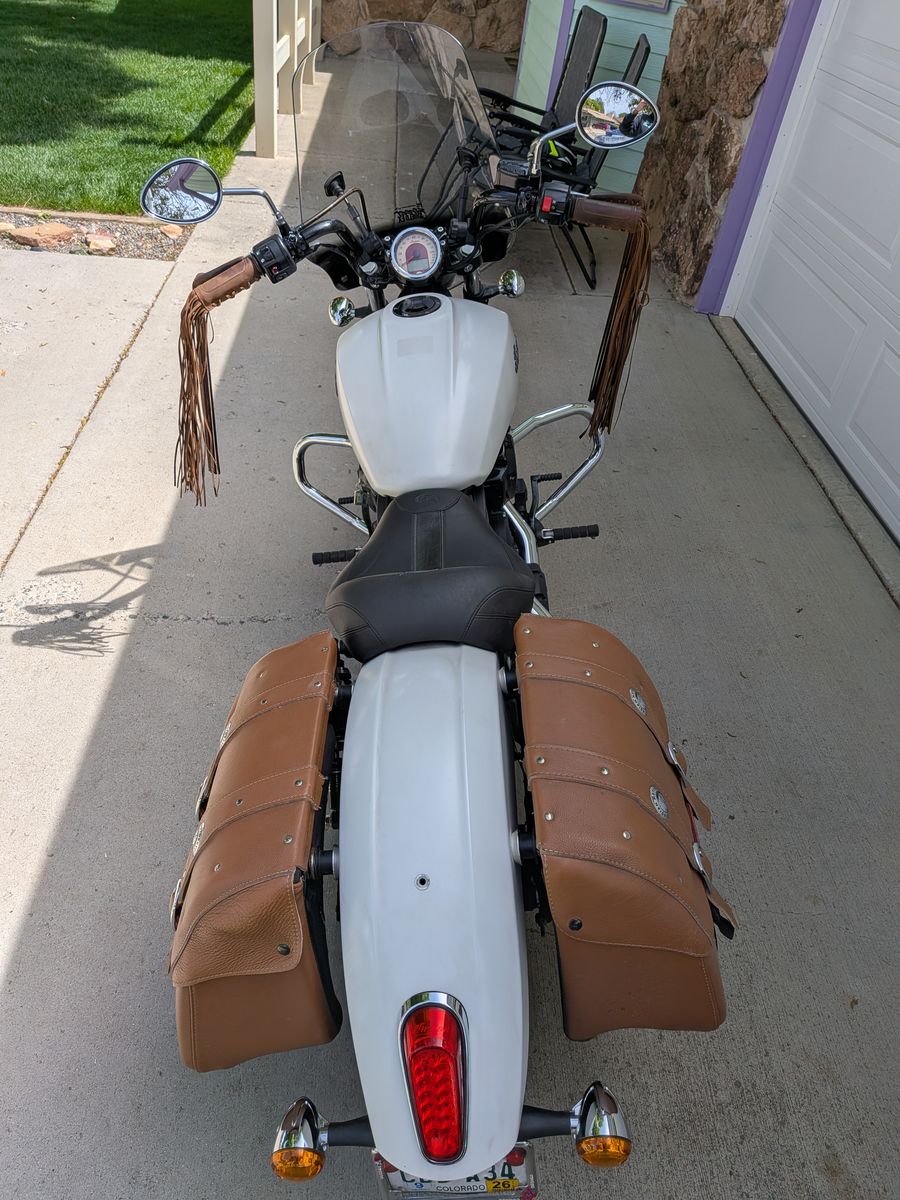 2019 Indian Scout Sixty ABS White Smoke. My wife is selling her bike, she has enjoyed it. She's the second owner and she has owned it for 5 years. Last year, All-terrain serviced the front brakes, bled the system, and replaced the front and rear tires. 1062 on the new tires, and upgraded the seat to a Mustang seat. I still have the original seat and backrest. This year, they replaced the right fork seal. It's always been garage-kept, never wrecked. She's been blessed with a great machine, but now she switched to a KLX 300 instead—cash only, no trades. If the post is up, it's available, so please don't ask.