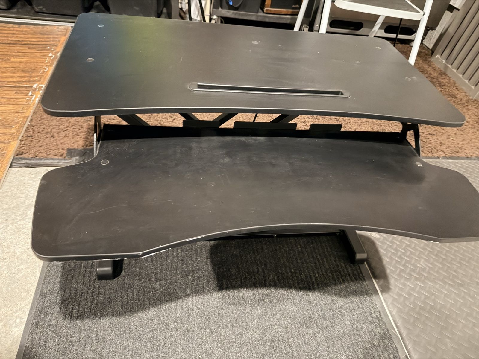 Goes up a couple fit. Will fit any desk. Has nice hydraulic to lift so you can stand and work at your desk.
