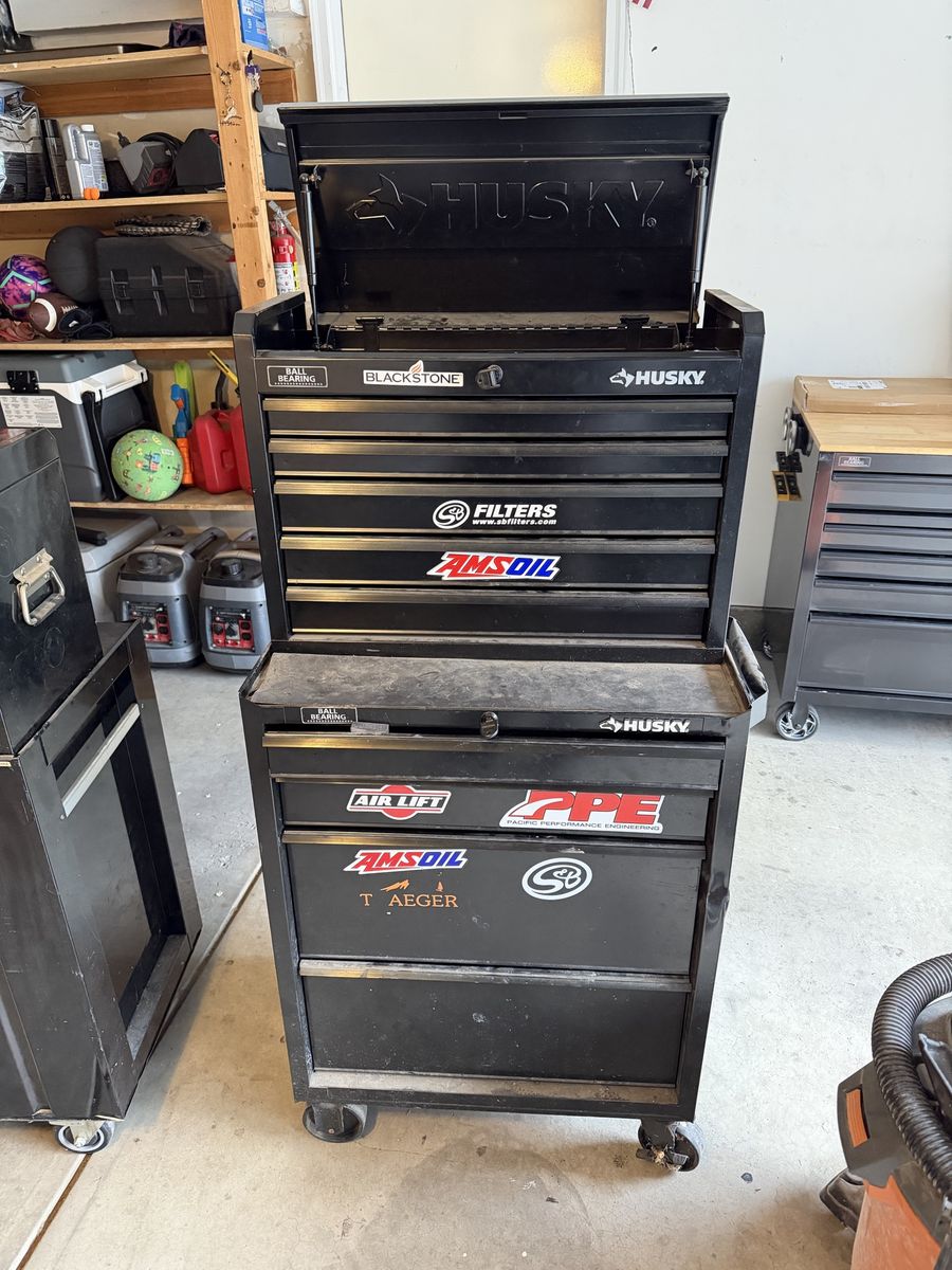 The Husky tool box with the top open. All drawers work as they should except the top drawer on the bottom half. Maybe an easy fix, I don’t know. Has liners throughout