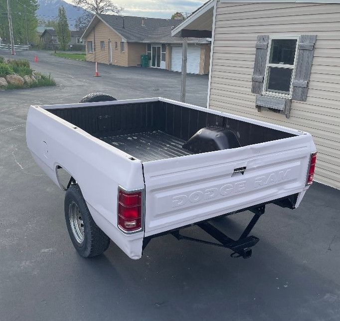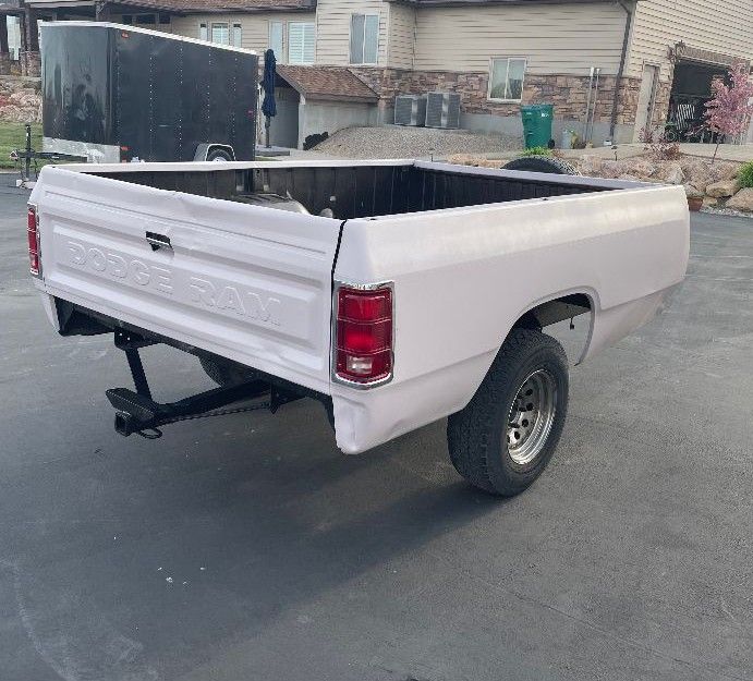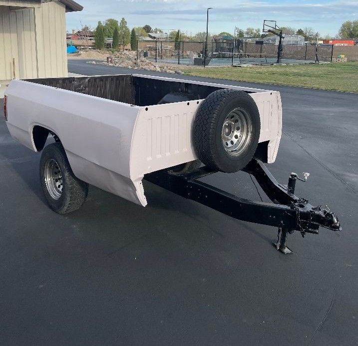 70's Dodge Truck Bed Trailer. Bed is 8' x 5.6'. Frame & body painted. Includes retractable trailer jack and spare tire. New tail lights installed.