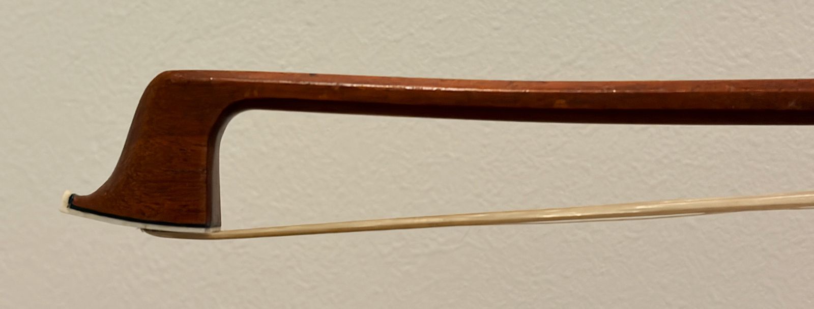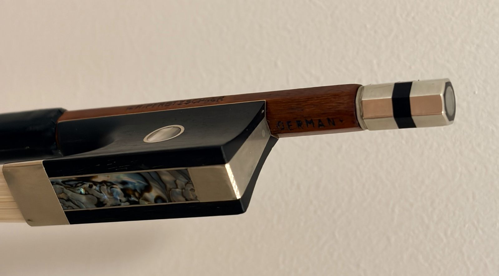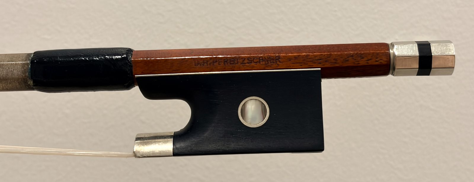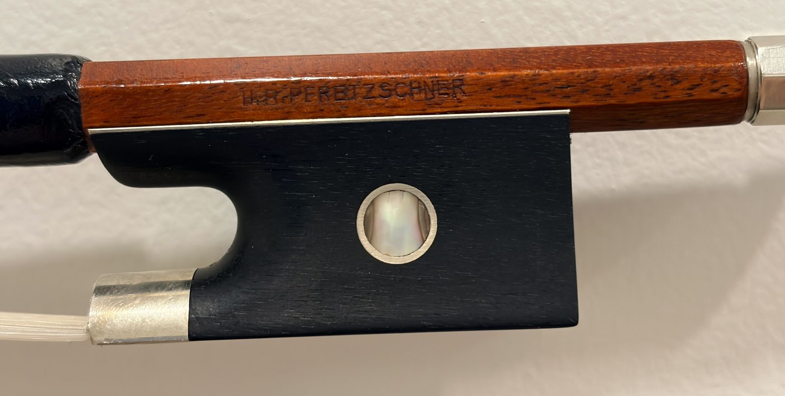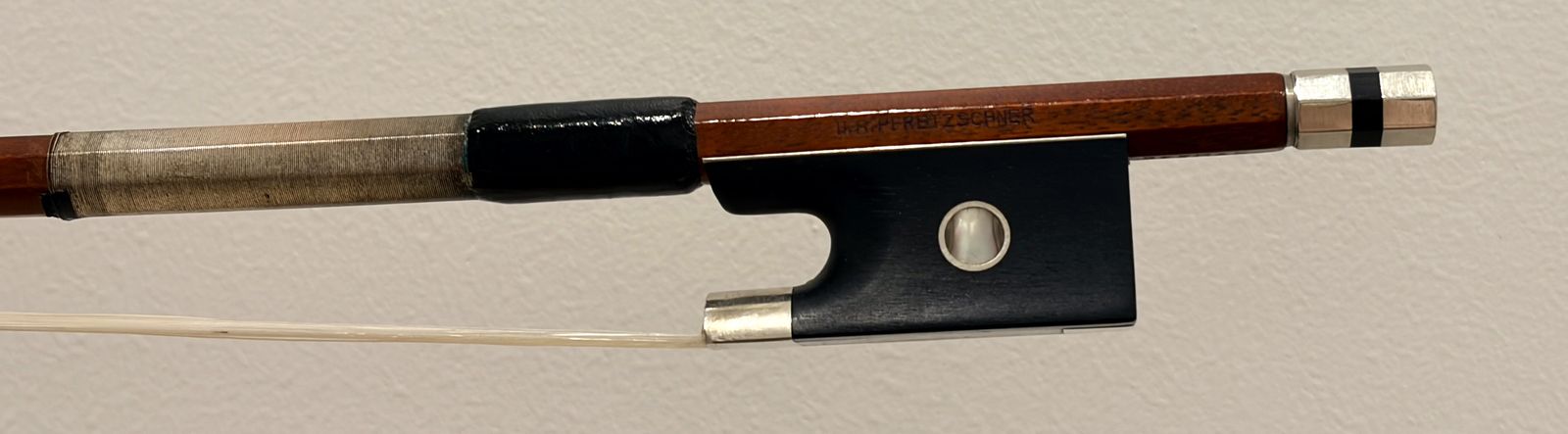 PayPalA refined German violin bow crafted by Hermann Richard Pfretzschner, an accomplished maker who trained and worked with J.B. Vuillaume in Paris. His work often reflects the stylistic influence of F.N. Voirin. The bow is exceptionally well preserved and is a very nice playing bow with a wonderful tonal quality and fine handling. The stick is made from fine red-brown pernambuco, octagonal in shape, and beautifully finished. The frog is ebony with silver mountings. The button is ebony with silver cap. In very good condition and ready for professional use, the bow has been professionally rehaired just last week. The bow measures 29 inches in length and weighs 59 grams.