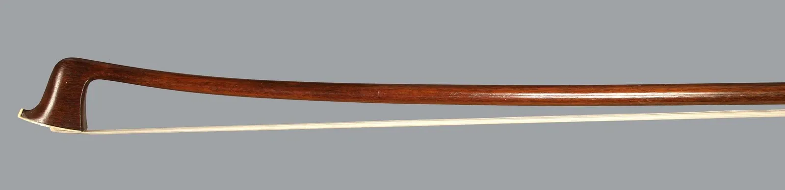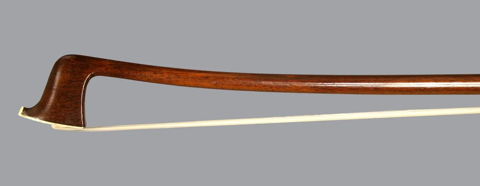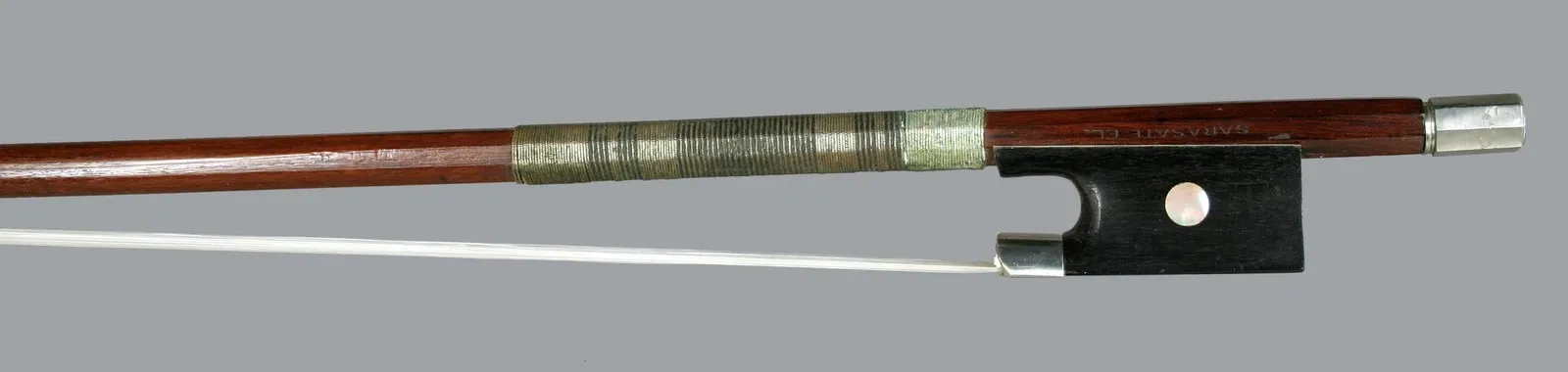 PayPalA fine old French violin bow made by Jerome Thibouville-Lamy c. 1920, branded "SARASATE EL." to the stick. This is a VERY NICE BOW in excellent, all original sate of preservation (including head plate and winding). The stick is dark red brown pernambuco, round, strong with good balance and very nice sound. The bow is ready to play with new hair. The length of the bow is just over 29 inches and the weight of the bow is 57 g (with light tinsel/silk winding).