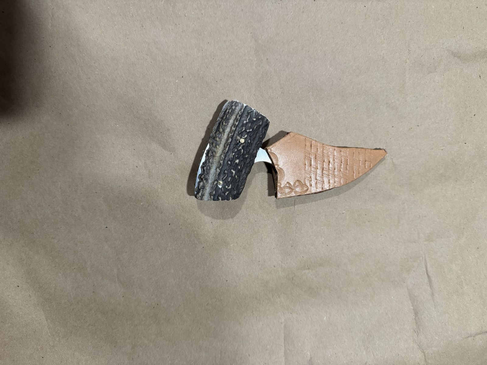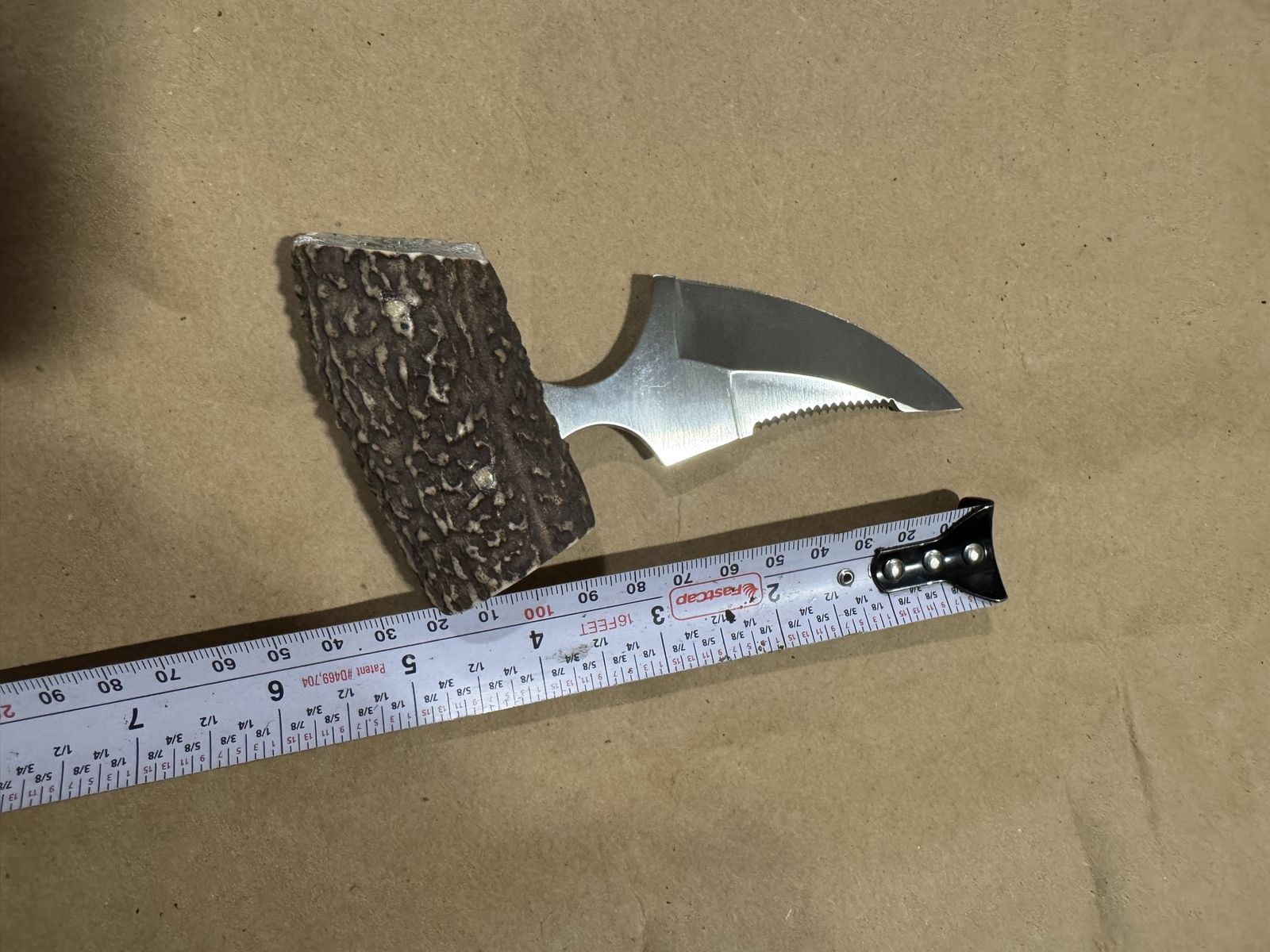 Awesome shark tooth knife. 3in blade, 5in overall. Genuine leather cover, authentic antler hilt. Razor sharp.