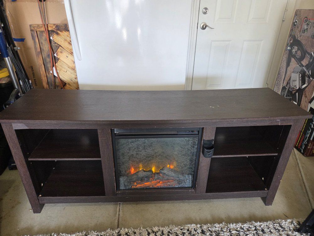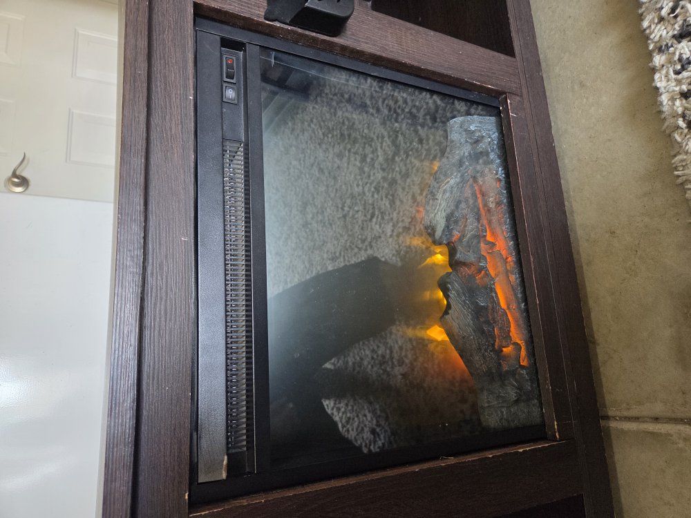 Tv stand with fireplace. heat works and lights has a tv remote holder. $75