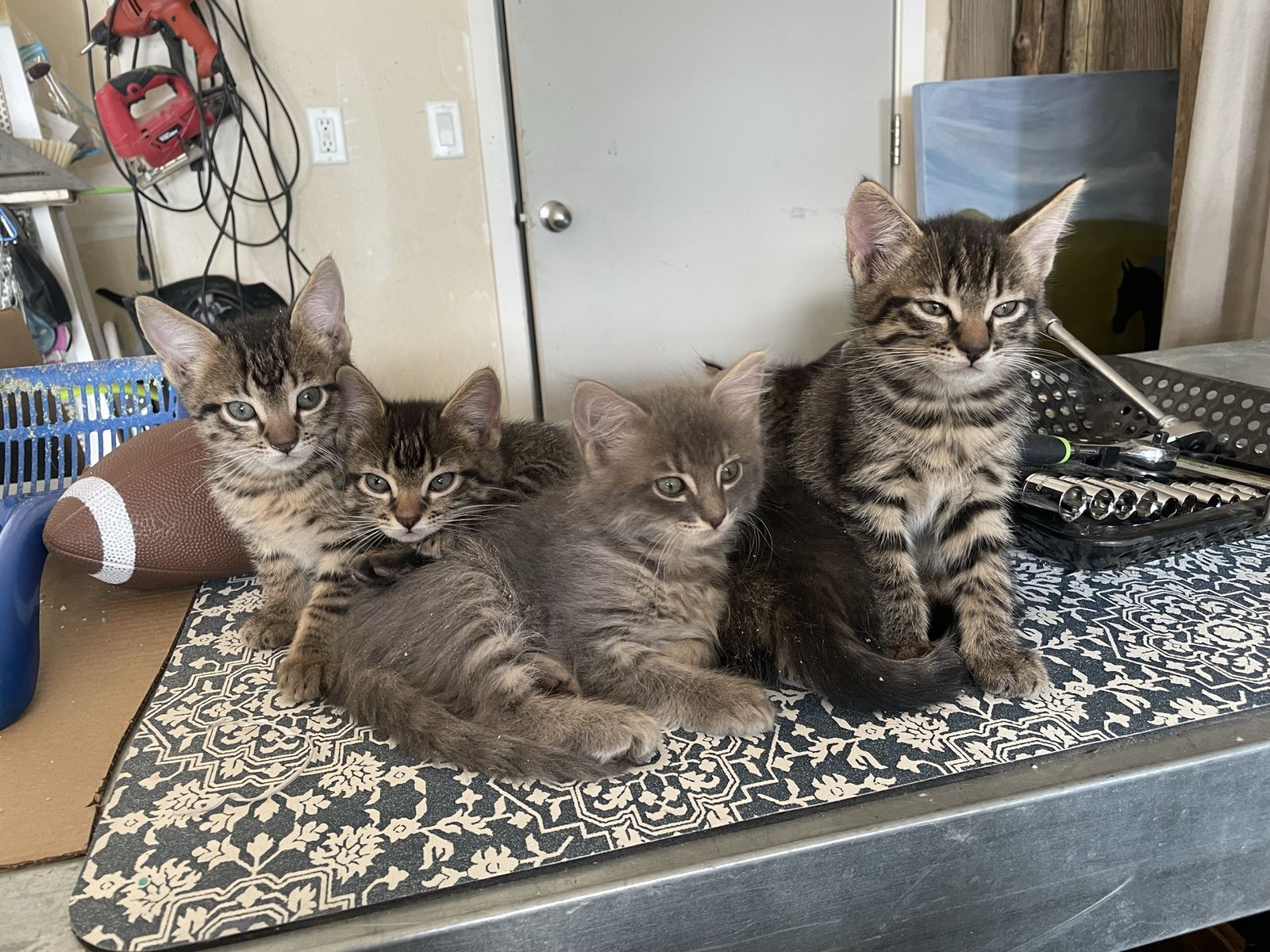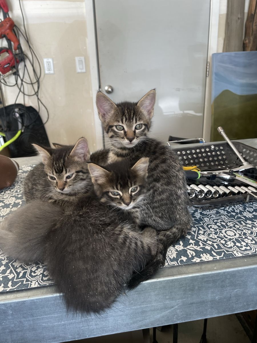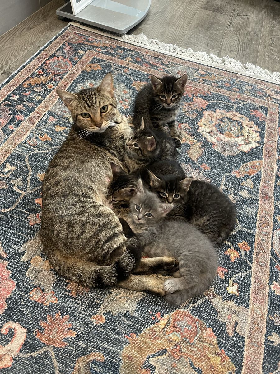 Kittens are 8-weeks and ready for good home. Litter trained and eating regular food. Spotted tabby mix. Beautiful and well loved. Mom is small, regal, and loving, about 8 lbs.