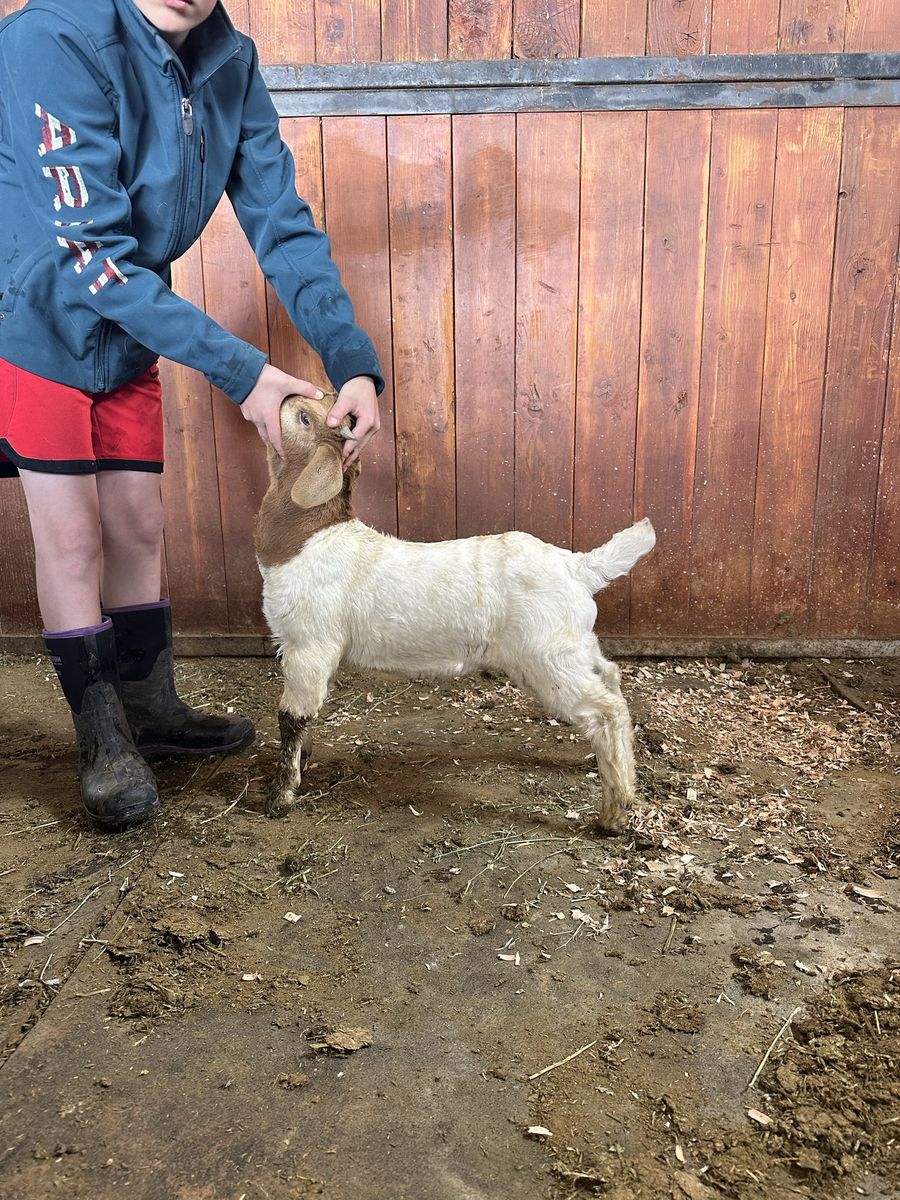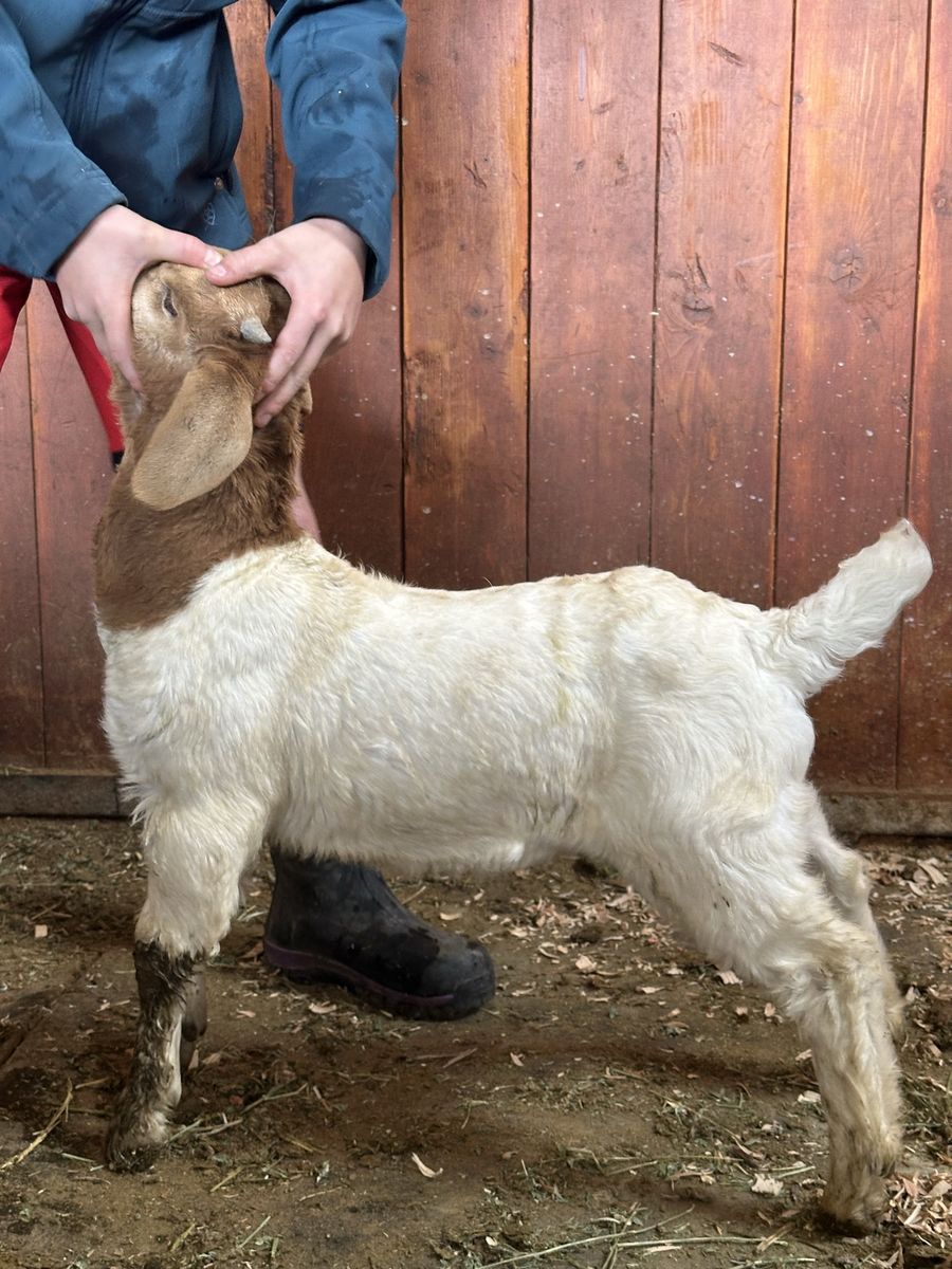 Our thickest kid could go as a buck or whether. His mother is a daughter of HEIR TO THE BEAR. This little buck is by our ABGA registered buck. If you decide you want papers, they would be 50 to 60% on the registration papers because the females they are by are well bred but not from ABGA registered parents. $500 no registration $650 with registration Born 2/25/26 and ready to leave now.