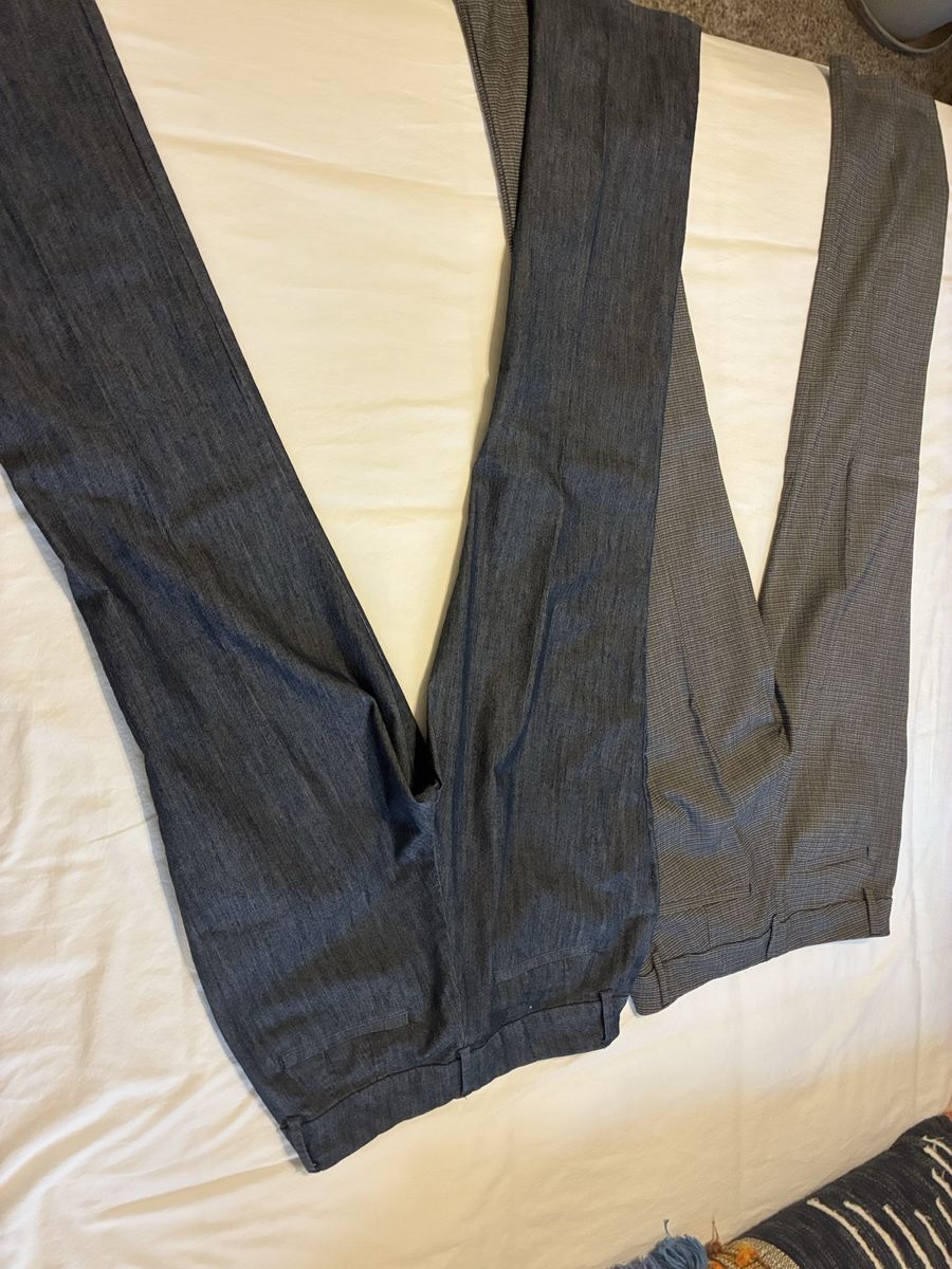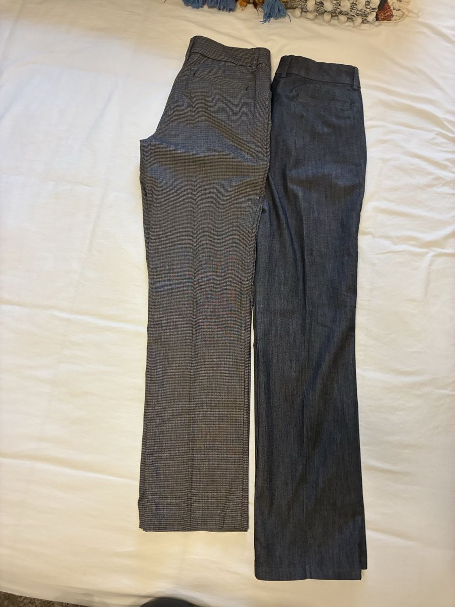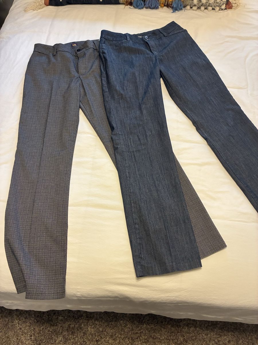 VenmoVersatile bundle of 2 pairs women's pants! One pair is Lee brand, size 10M, dark grey with a subtle pattern. These are wrinkle free, super handy. Material is a comfy blend of polyester, rayon, nylon, and spandex. The other pair is dark blue, has a nice dress pant vibe, 10 long. Both great for work or just everyday wear.