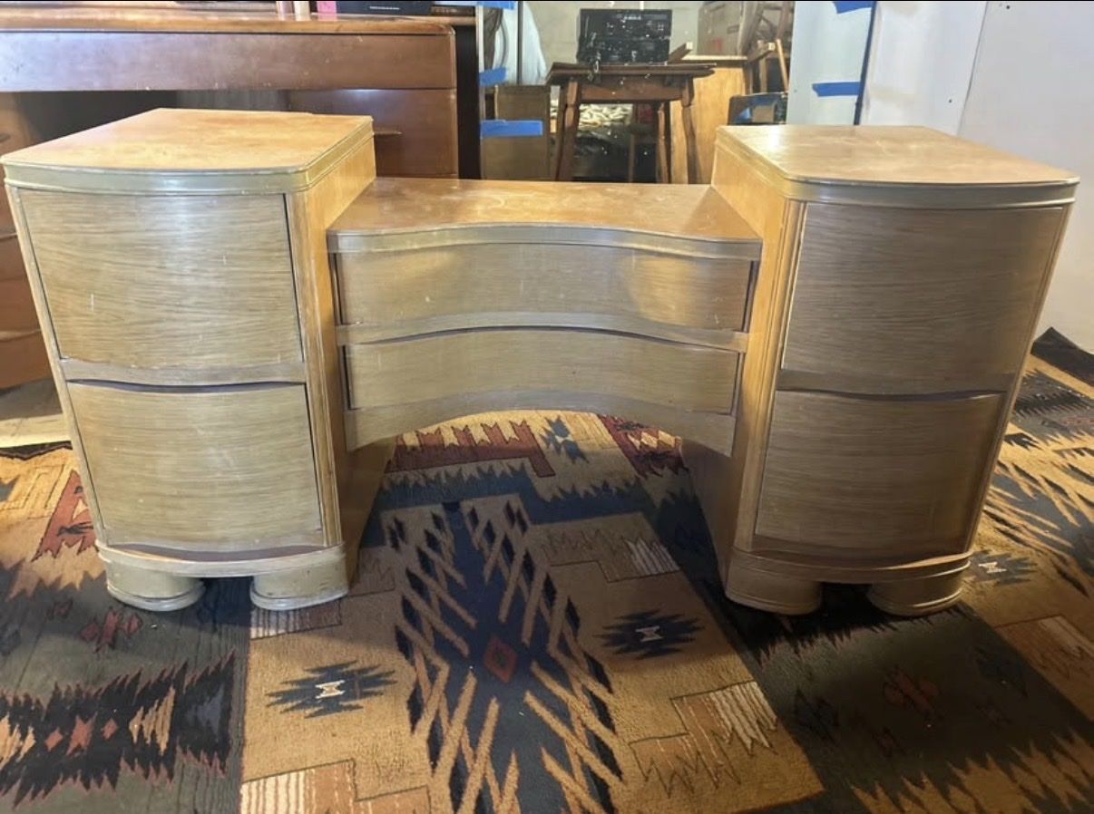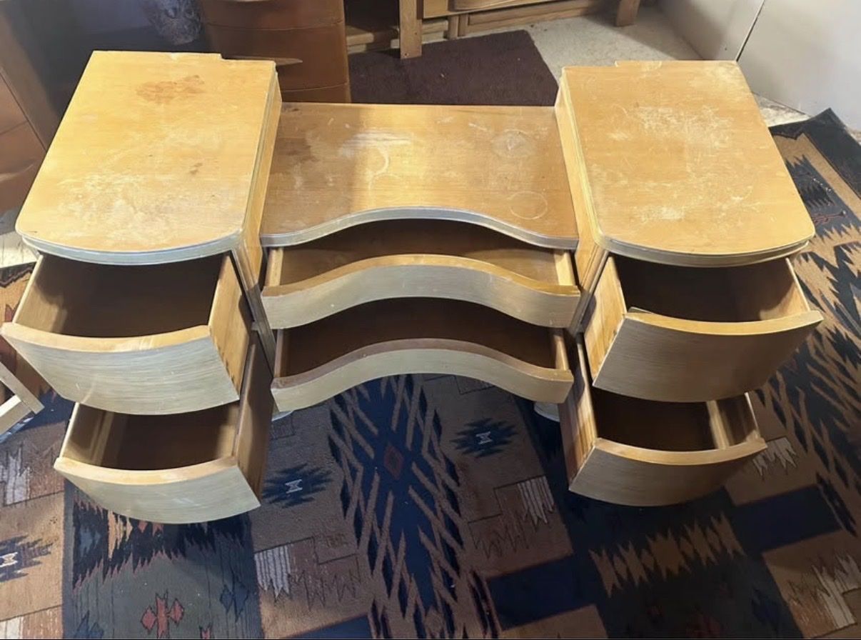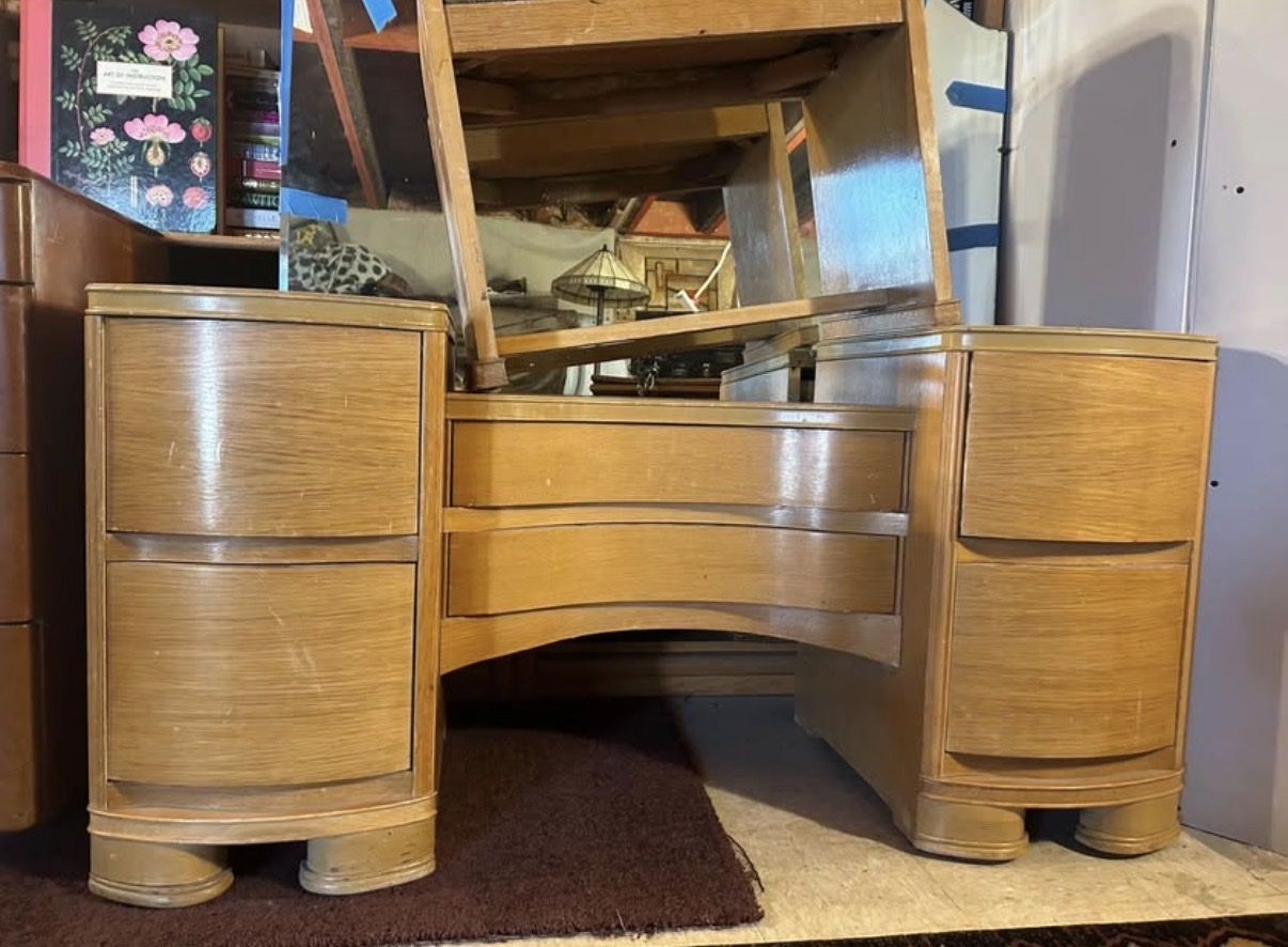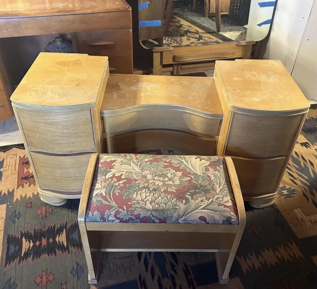 PayPalSuper cool vintage vanity. Could be refinished or used as is. Mirror has a small chipped corner but otherwise in great shape. Two of the brackets that hold the mirror are broken. I have tape holding the mirror for moving purposes. The mirror will stay in place even though two brackets are broken. Everything is completely functional and the drawers slide freely. Beautiful statement piece.
