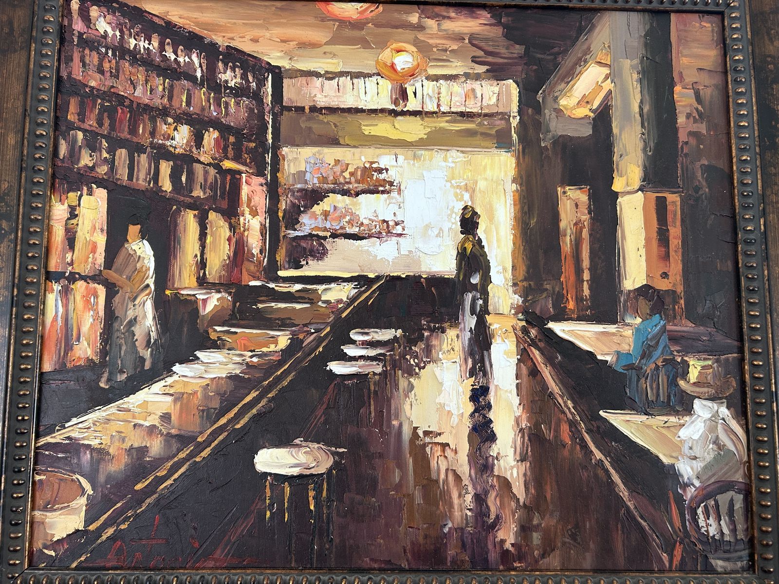 Elevate your space with this richly textured, impressionist-style oil painting capturing an intimate restaurant or wine bar interior. The composition draws the eye down a glowing central aisle, framed by warm ambient lighting, shelves of bottles, and softly rendered figures—creating a sense of depth, movement, and atmosphere.