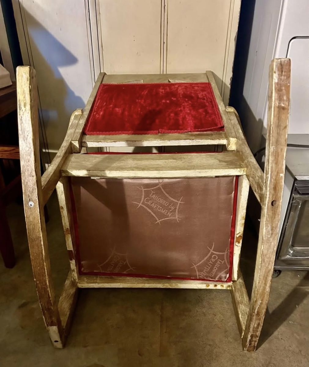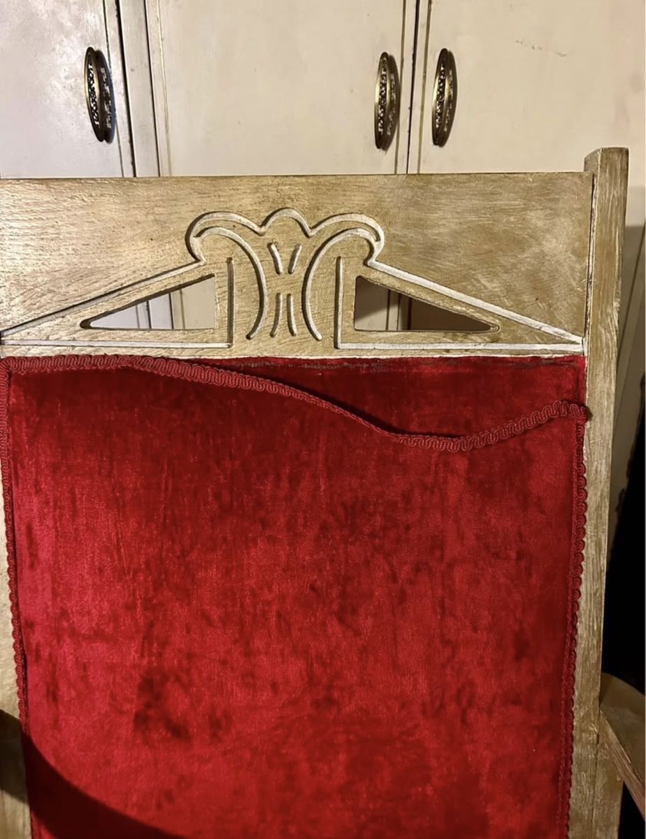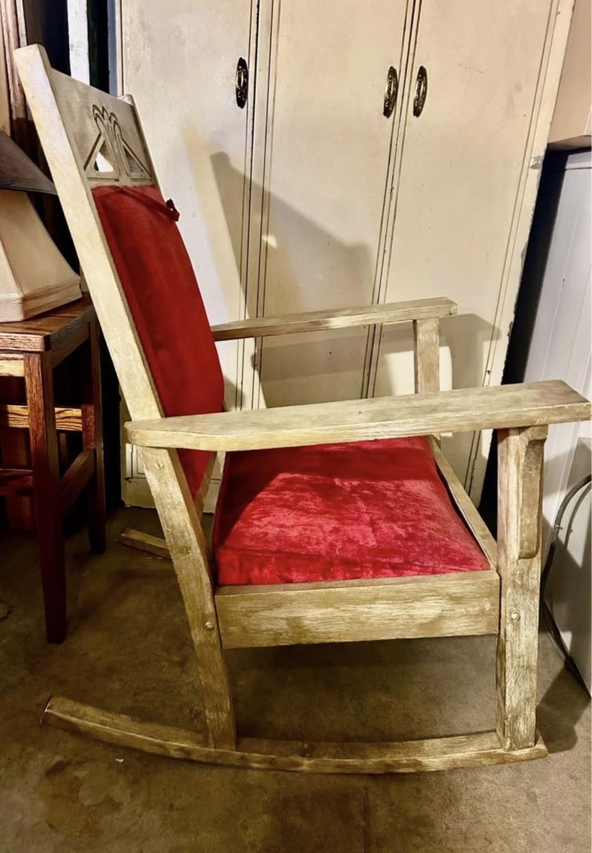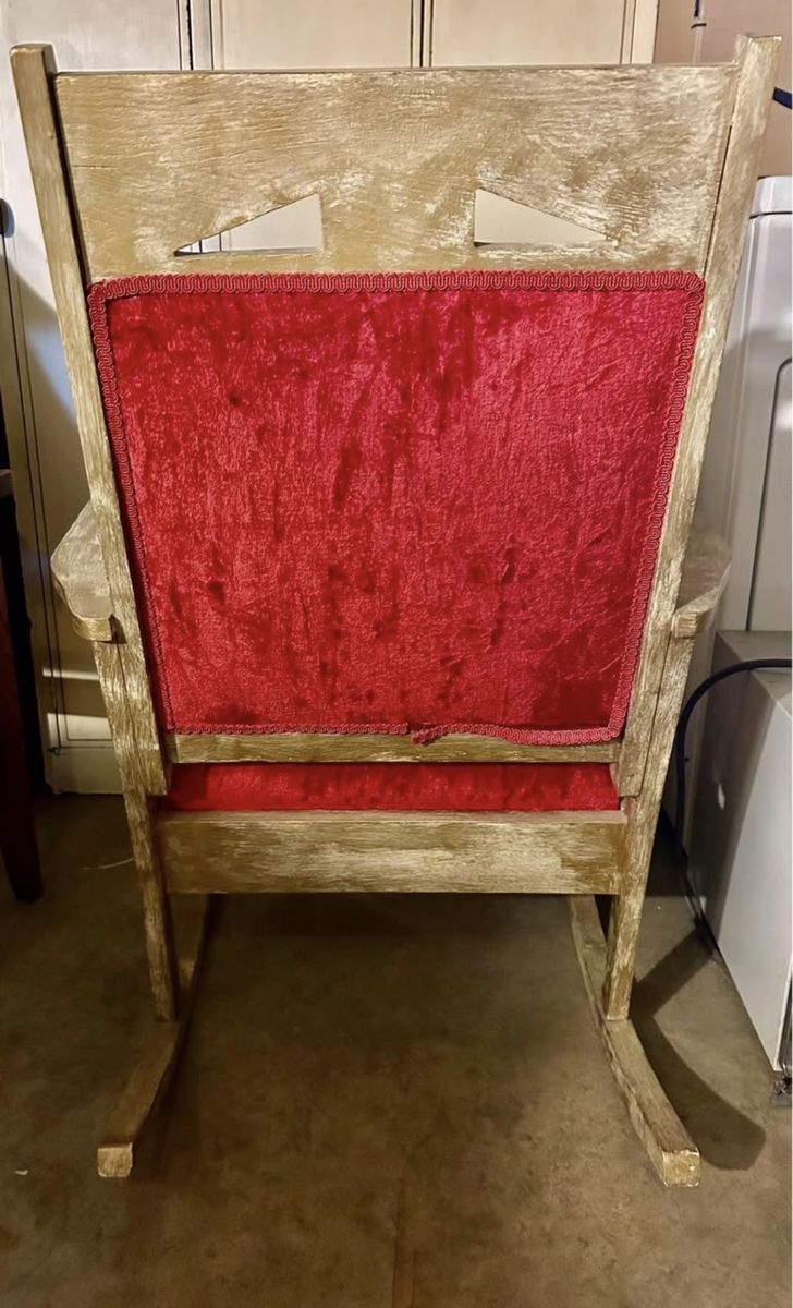 PayPalEarly 1900’s whitewashed solid wood rocking chair, red velvet upholstery, carved headboard, mission style.