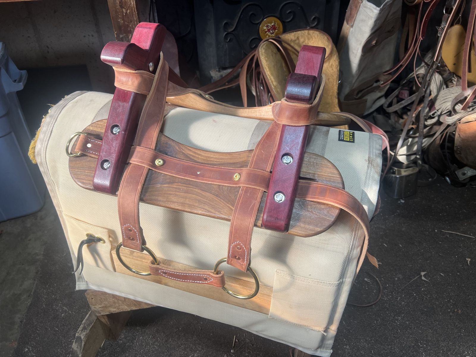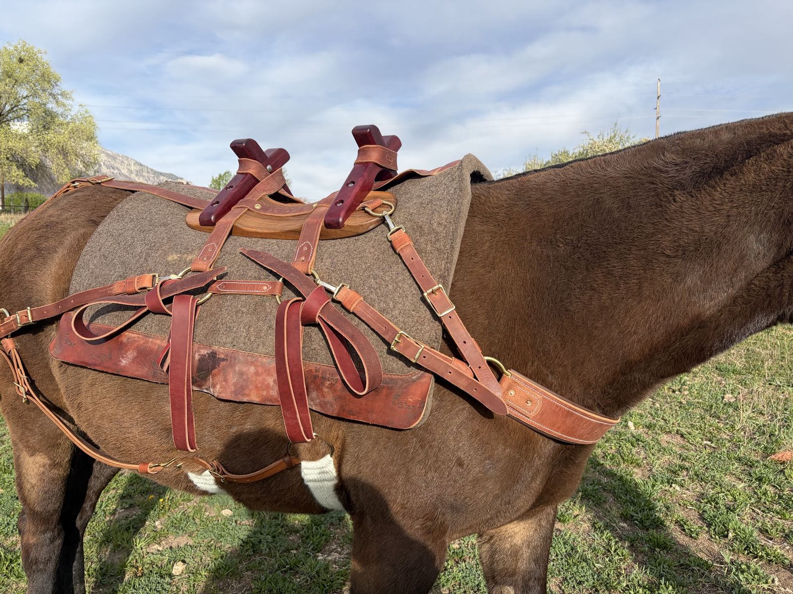 This is the very top of the line Pack Saddle made out of solid brass hardware and Herman Oak leather saddle comes with new pack pad and panyards set rigged up and ready to go. This saddle is made by 3E leather