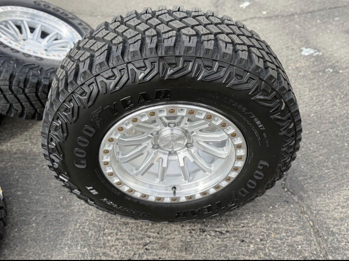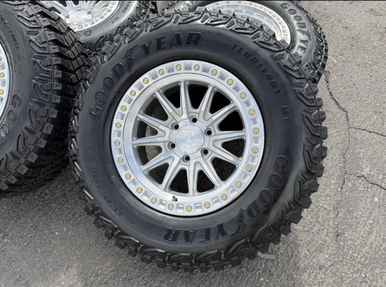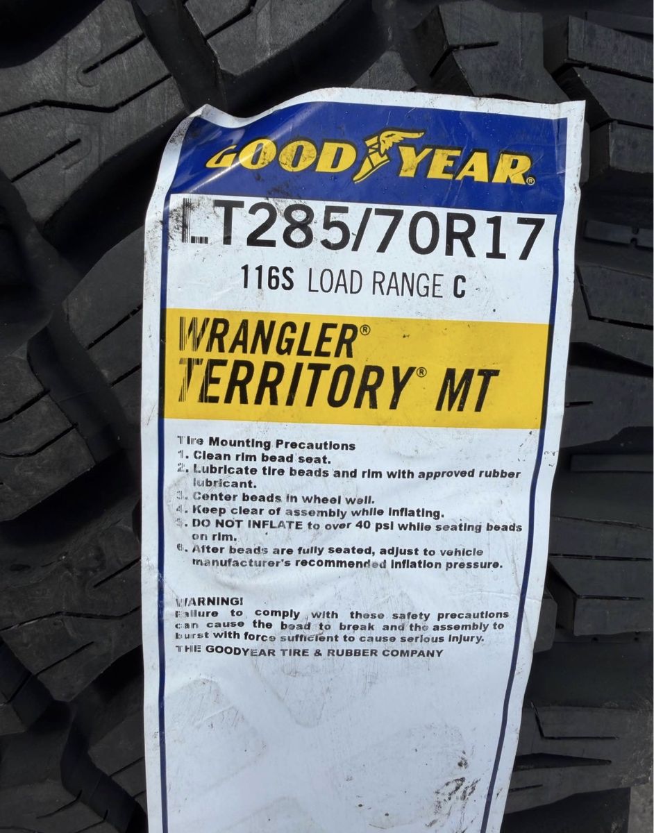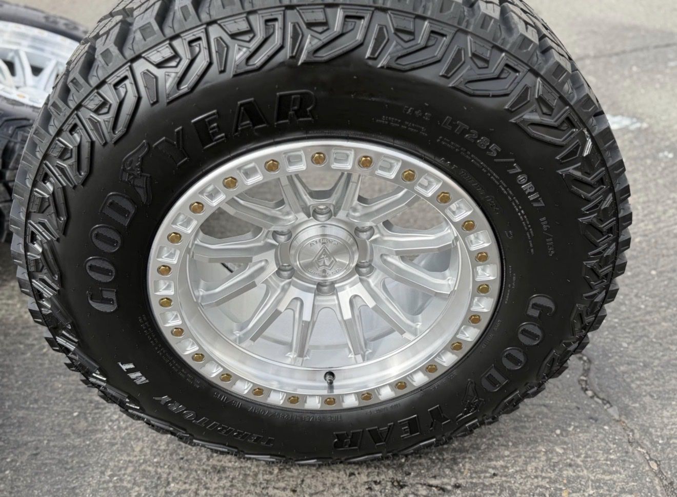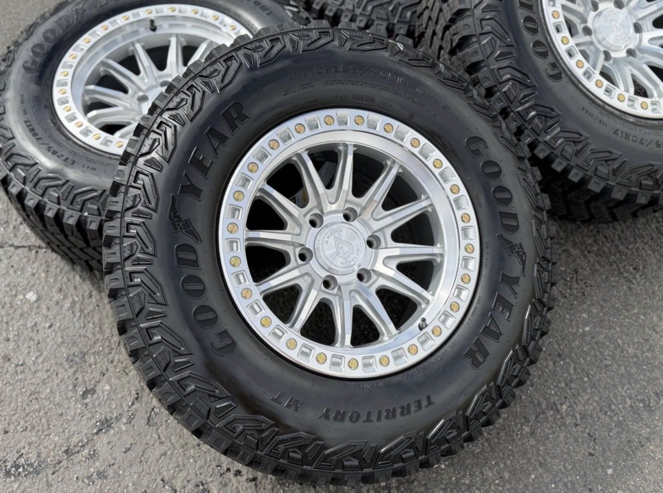 285/70r17 Goodyear Territory MT tires mounted and balanced on new Silver Arena Mission wheels. 17x9 00et offset. 6x5.5 bolt pattern (6x139.7). These fit Chevrolet Silverado 1500 GMC Sierra yukon tahoe Nissan Titan Ford Ranger and Toyota Tacoma’s
