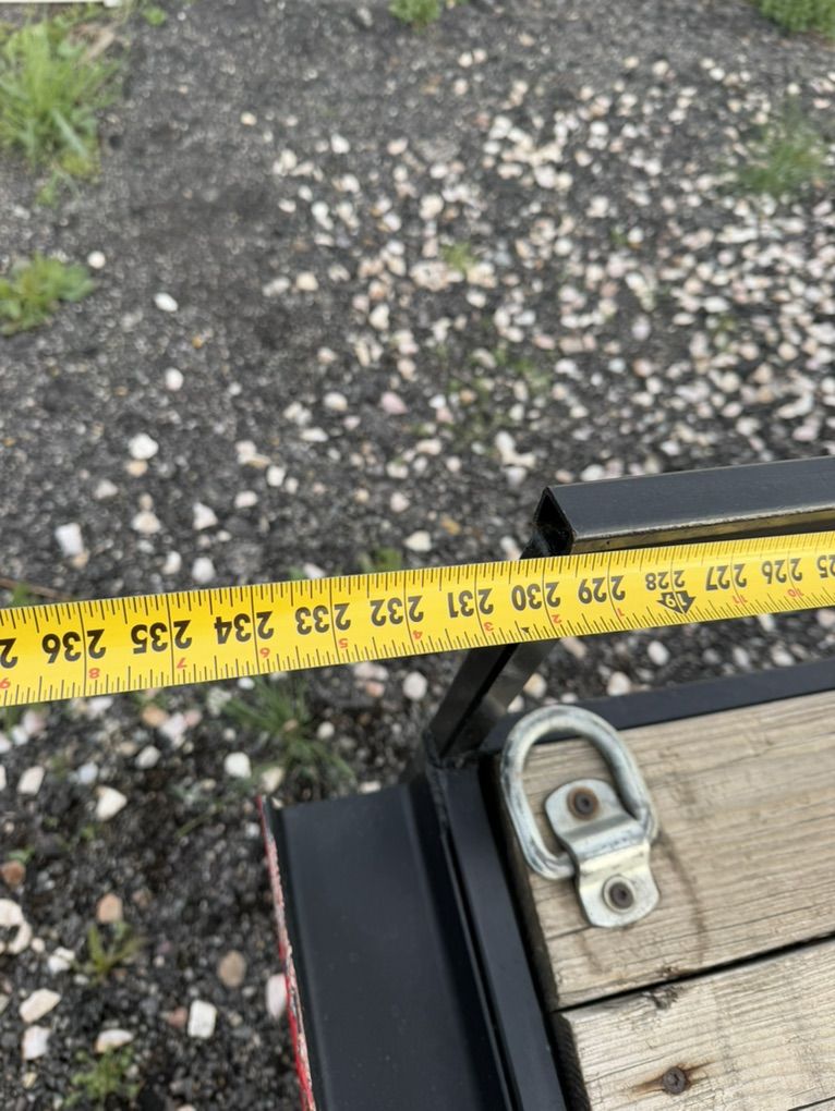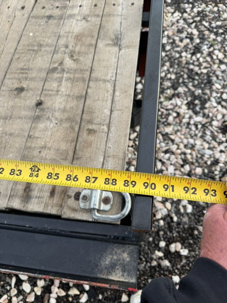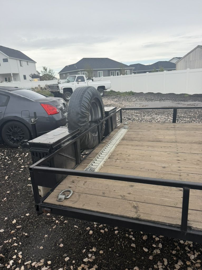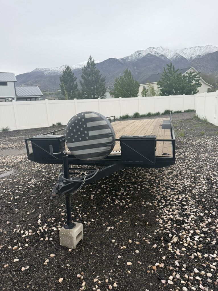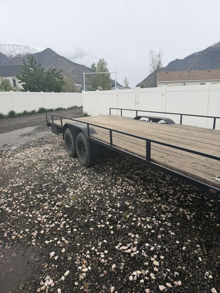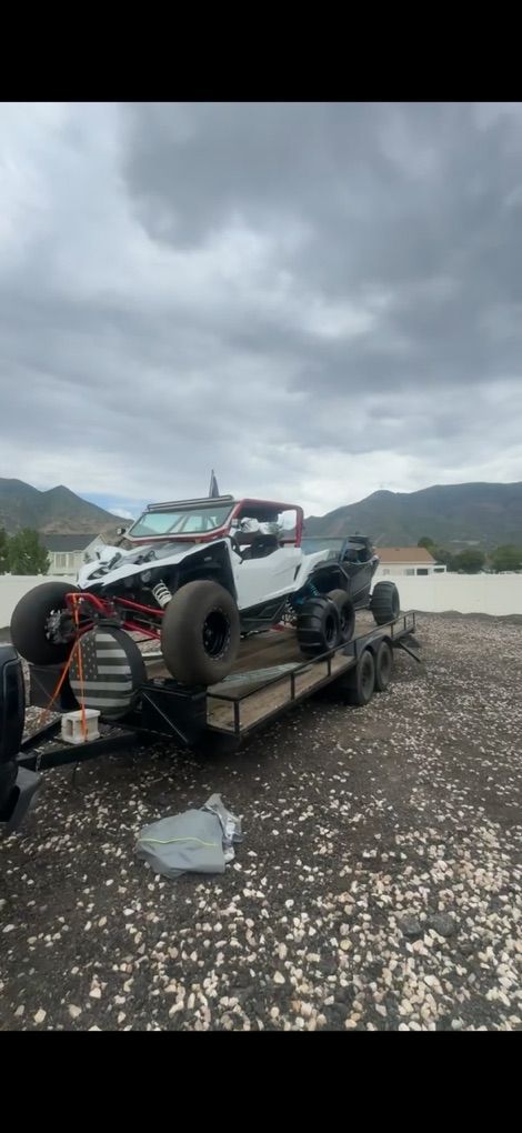 19’ 6” long 7’ 5” wide Dual axle Will fit a two seat can am and yxz with front tires on the front boxes of the trailer Has ramps and storage containers on front of trailer 3,000 obo have title in hand Only reason for sale is we got an enclosed that fits both