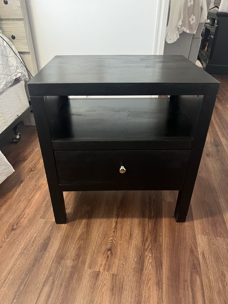 VenmoSelling a matching pair of black painted nightstands. These are great, sturdy pieces that offer a mix of open and closed storage.