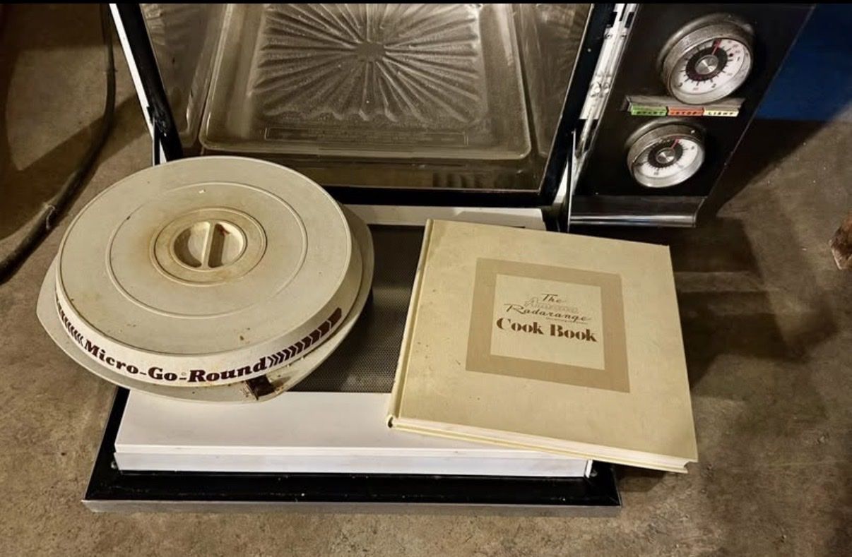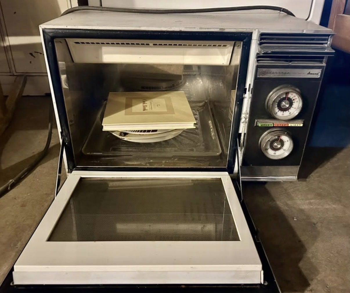 Amana vintage radar range with accessories. Super cool statement piece. Could be used as a movie/TV prop. These are highly collectible, especially with the original accessories. It did work the last time I tried it!