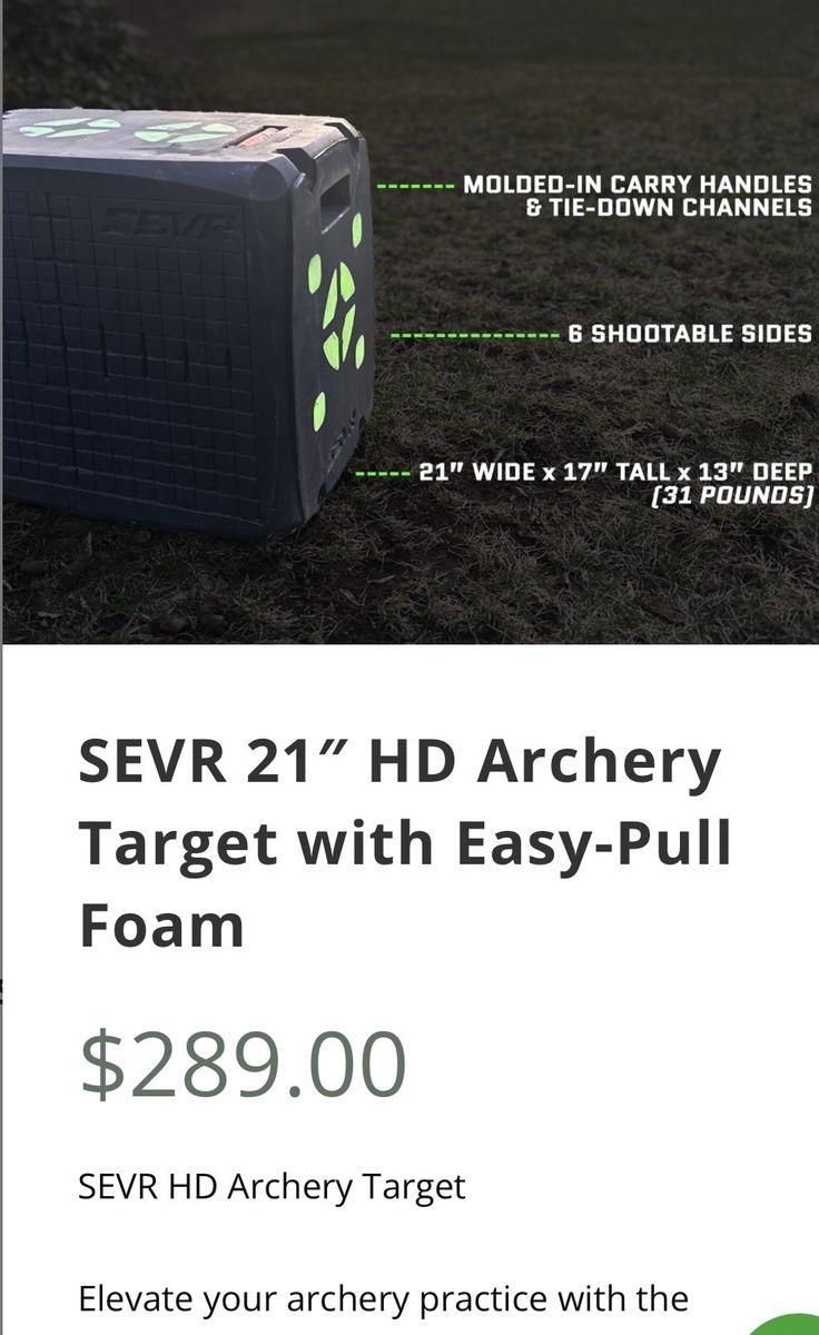 VenmoJust purchased and put 20 shots into it with target points. No shots with broadheads in this target. Still like new. Going a different direction. $289 on the Sevr website. Asking $200.00 Comes with arrow puller and golf tees.