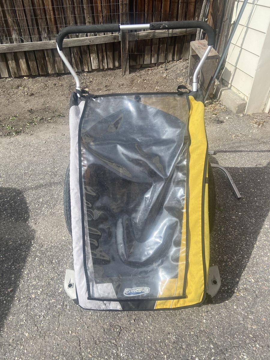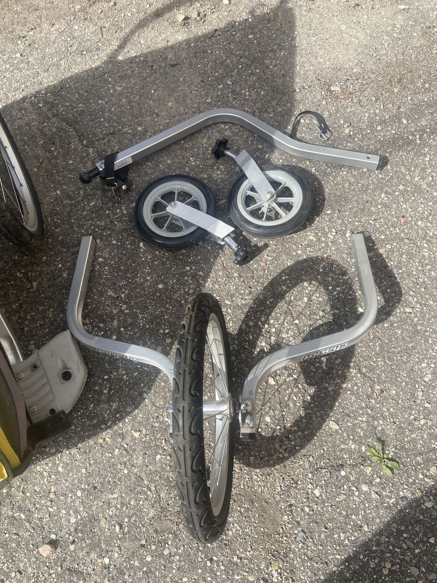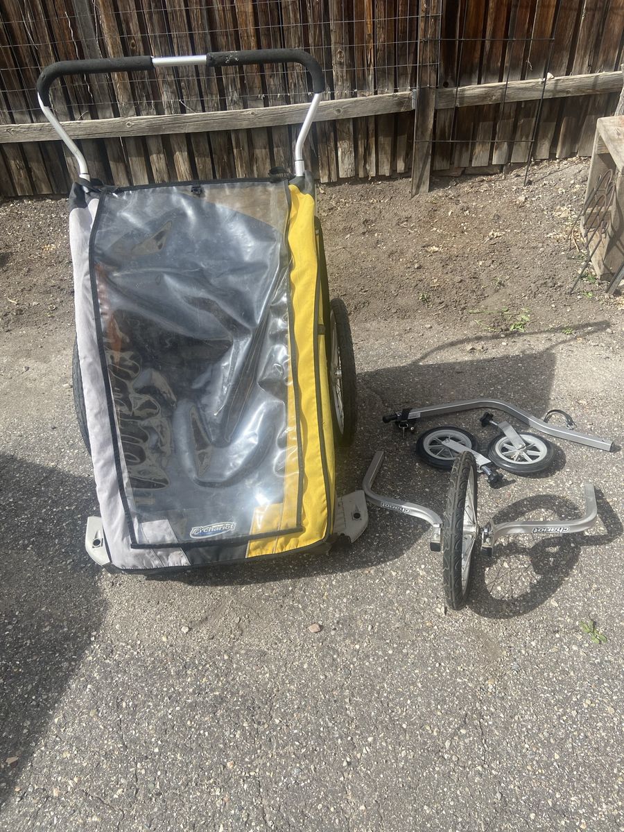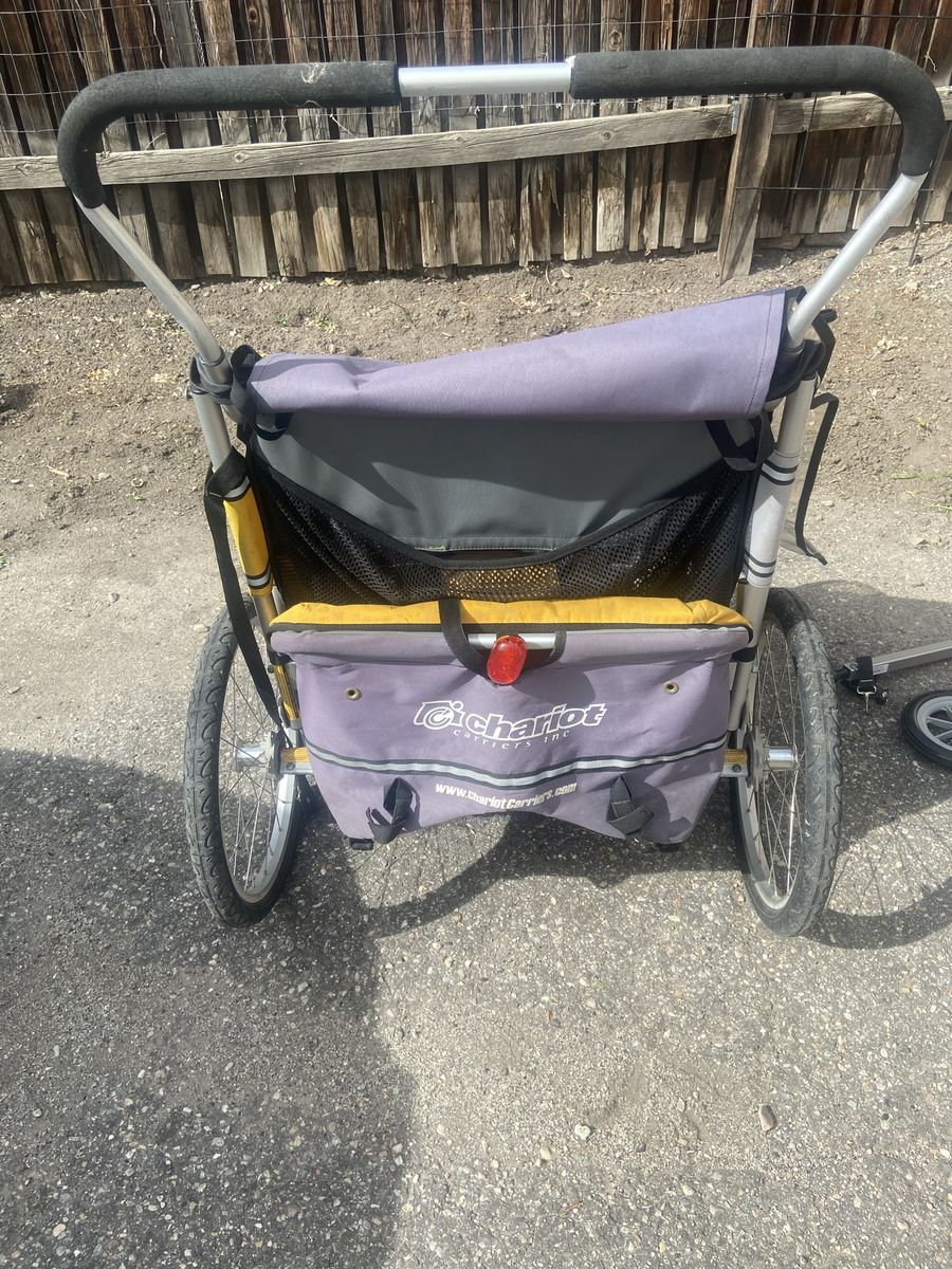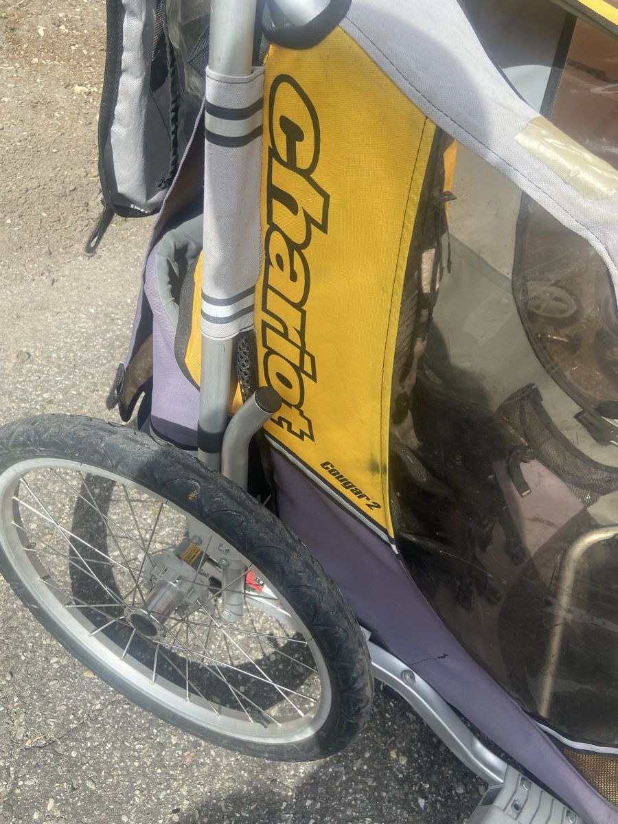 VenmoChariot Cougar 2 trailer stroller combo. Includes trailer attachment, single fixed wheel and double swivel wheels. Does not include coupler.
