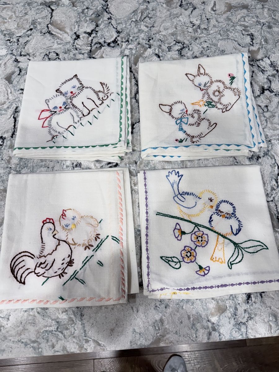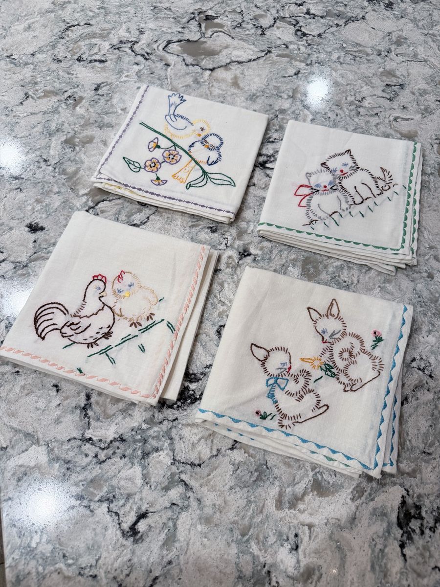 VenmoSweet set of 4 embroidered kitchen towels. Each has a different cute animal design; birds on a branch, two kittens, a hen with a chick, and two bunnies. Pretty embroidery work with colorful decorative edges on each one! Wedding gift over 50 years ago! 🧡🧡
