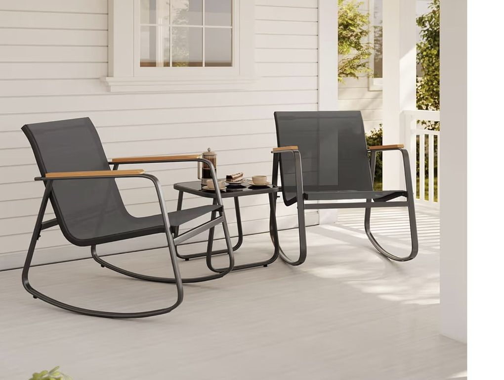 Why you’ll love it: Smooth, comfortable rocking motion Modern design fits patios, balconies, or backyards Tempered glass table — great for drinks or décor Perfect for relaxing or entertaining outdoors