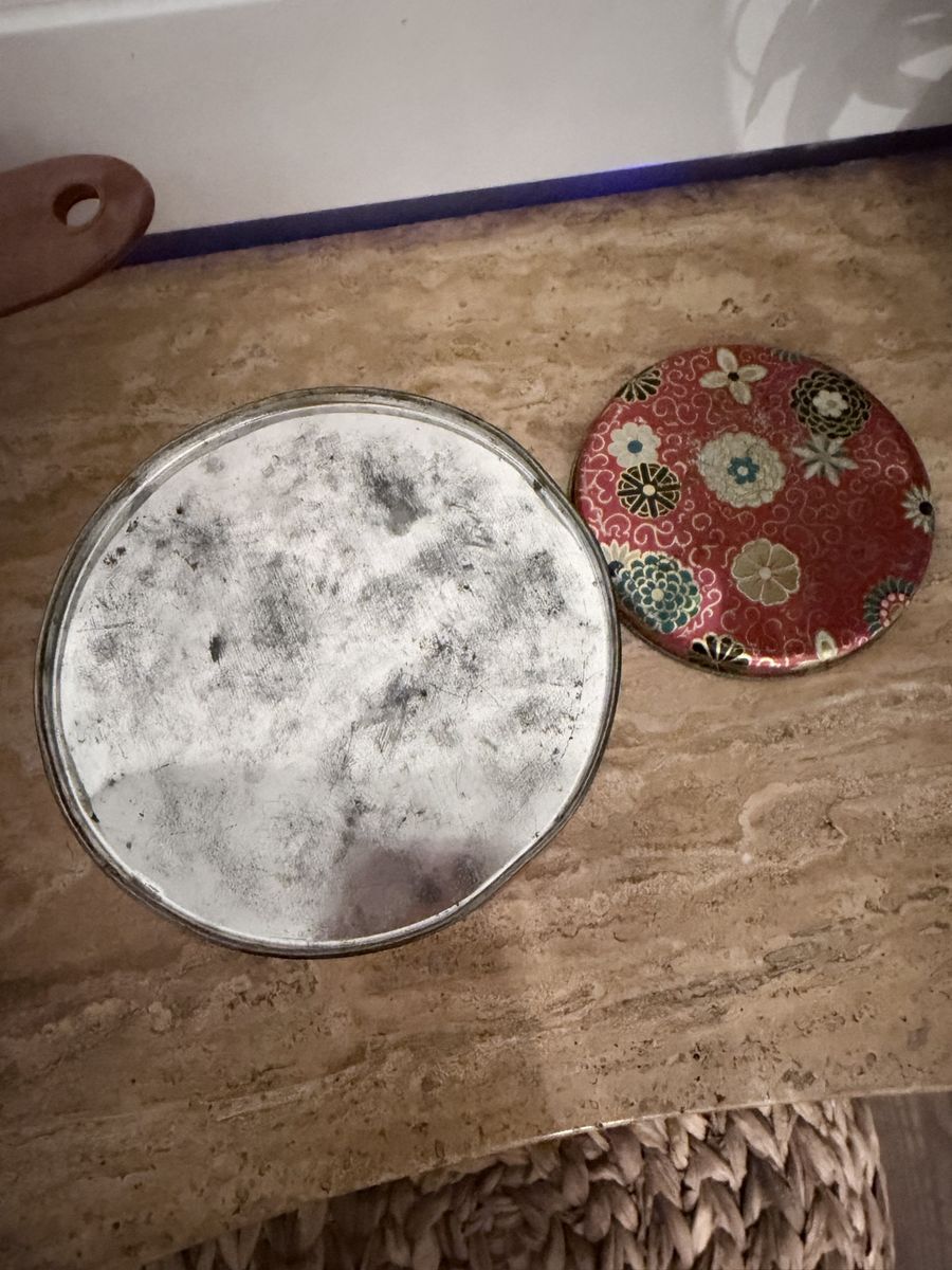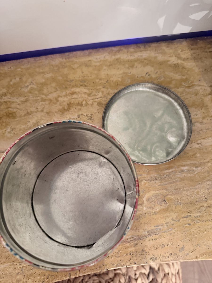 Venmo1950’s Decorative round tin. Lid comes iff easily. Great for storage like buttons - toys or crafts- or a very cute decorative piece. No rust !!