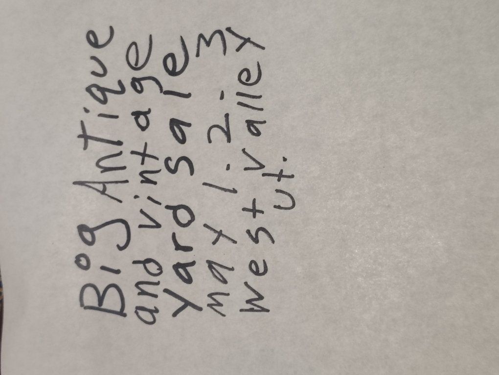 lots of antiques vintage collector items for sale in West valley May 1st 2nd 3rd Friday Saturday Sunday 8:00 to 5:00 all 3 days 3740 South River Lane off of 1200 West in the very back of Silo farms Mobile home Park
