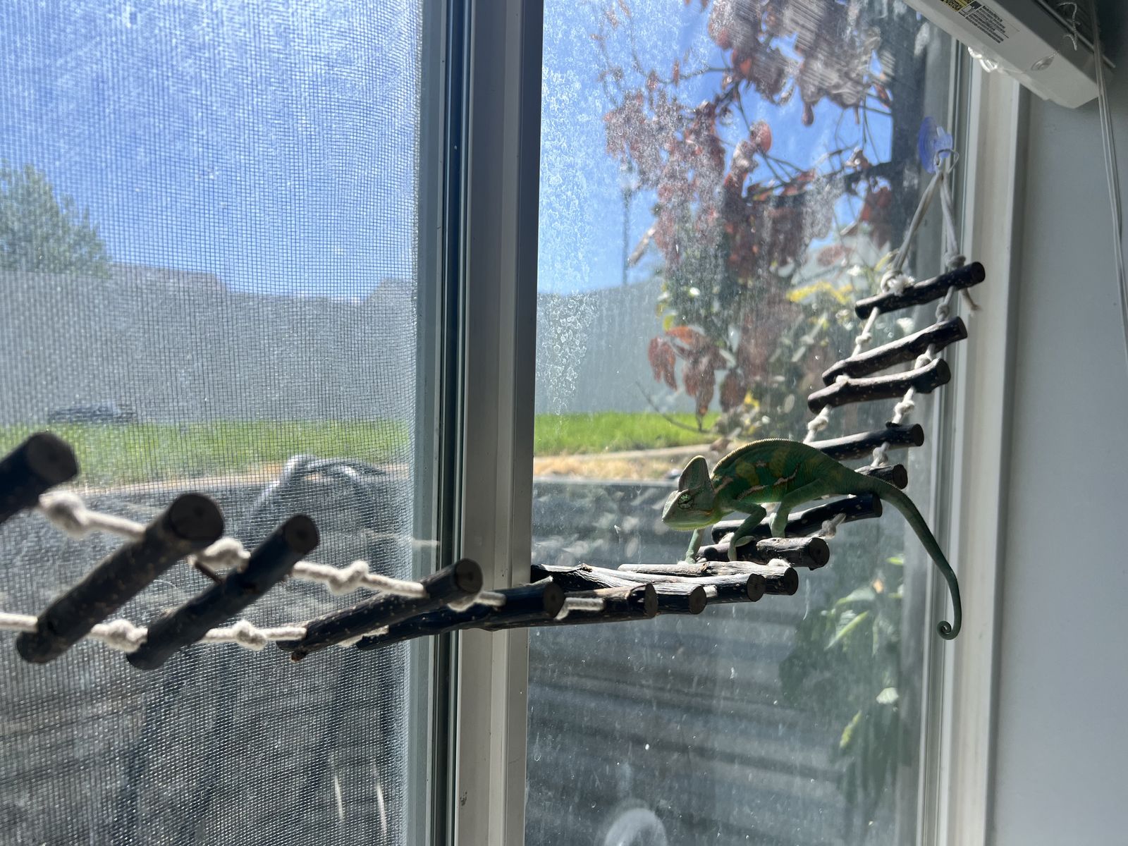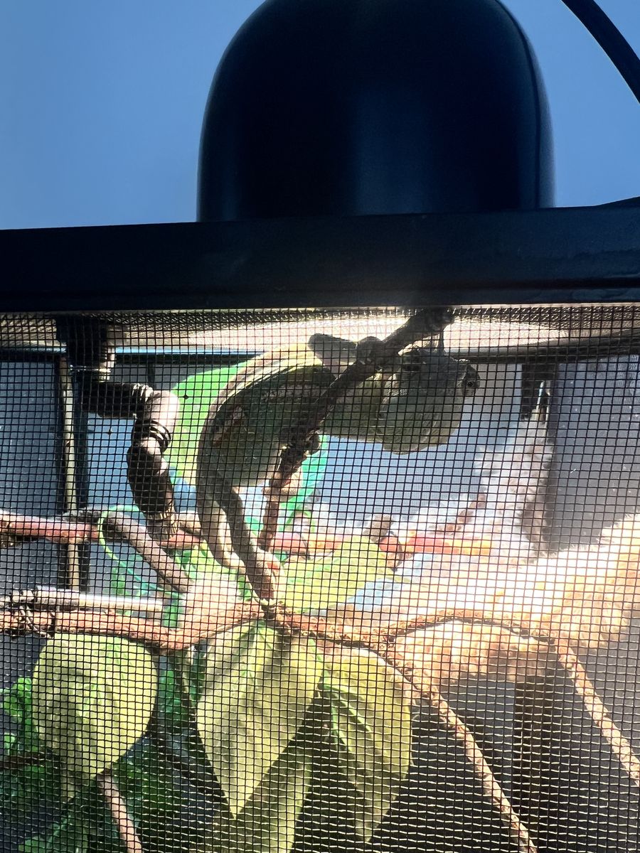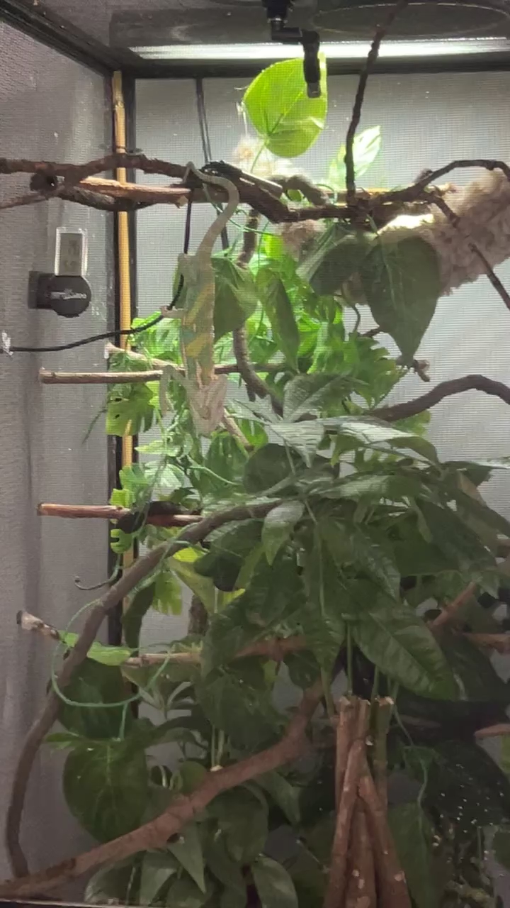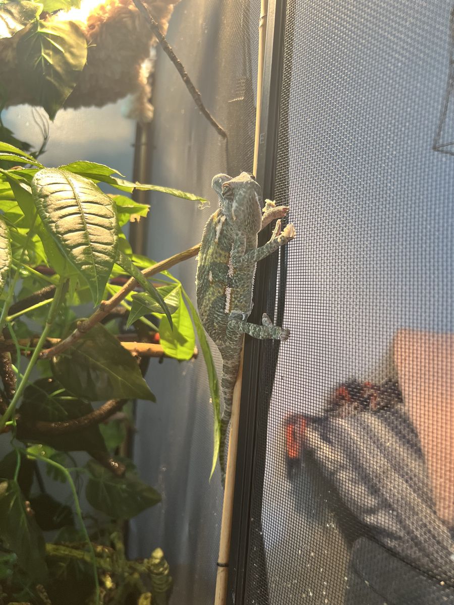We are trying to rehome him in an effort to not stress him out and deteriorate his health. These are pretty delicate creatures and we'd prefer if the person taking him had reptile experience. He comes with a super extensive setup; mesh enclosure with lots of live plants that are chameleon safe, heat and uv lamps and their timer, a drip drinking system, a humidifier for the night, humidity and temp gauges, a cricket/bug enclosure for keeping his food alive longer, and supplements. He also loves his window ladder which is pictured.