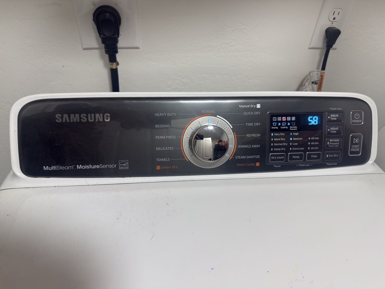 Samsung Electric Dryer (Model: DVE45T6000W) • Capacity: 7.5 Cu. Ft. • Key Feature: MultiSteam Technology. Includes Steam Sanitize and Wrinkle Away cycles (great for refreshing clothes without washing). • Sensor Dry: Automatically adjusts time so you don’t bake your clothes. • Bonus: Smart Care enabled for easy troubleshooting via phone app.