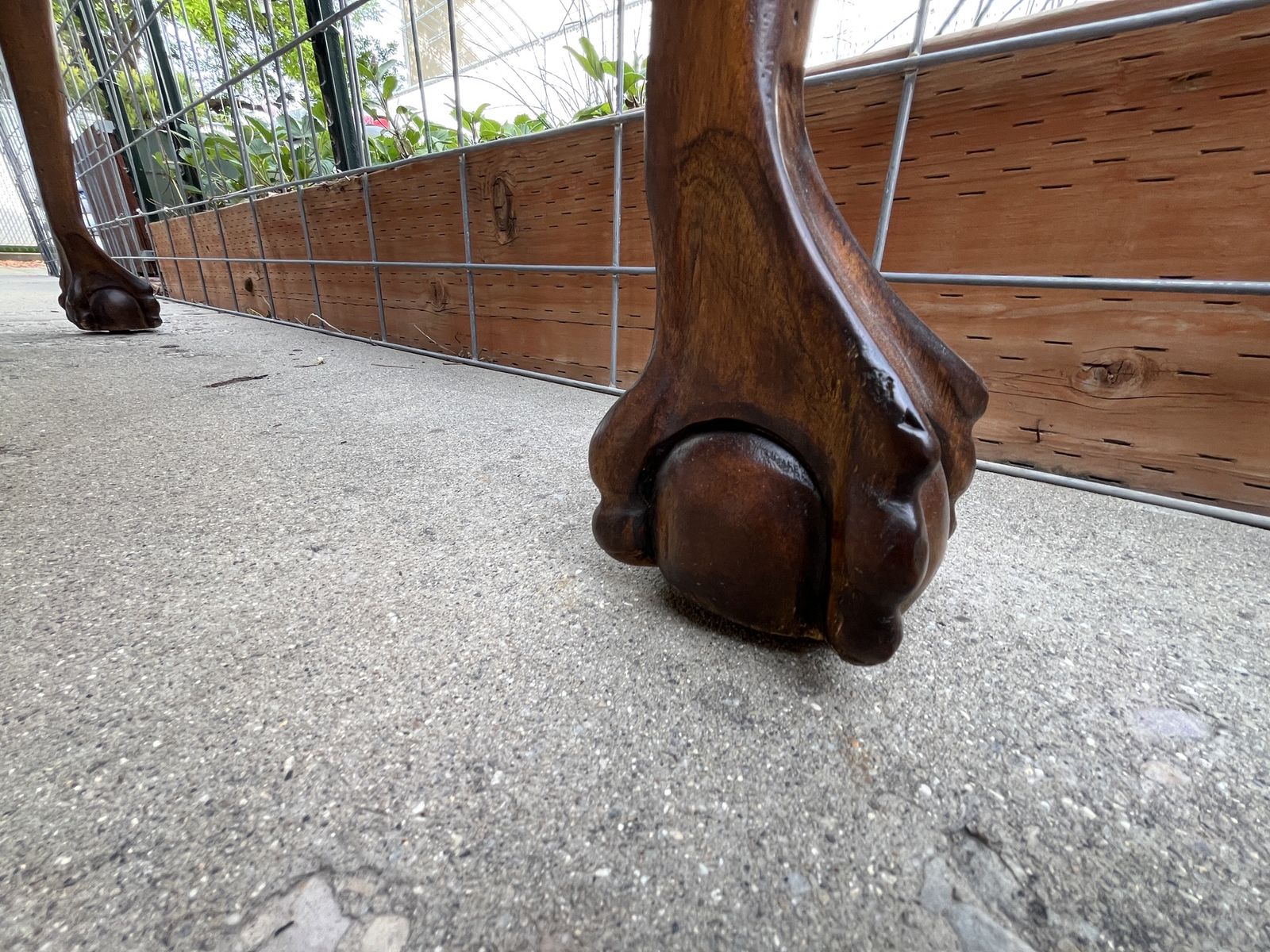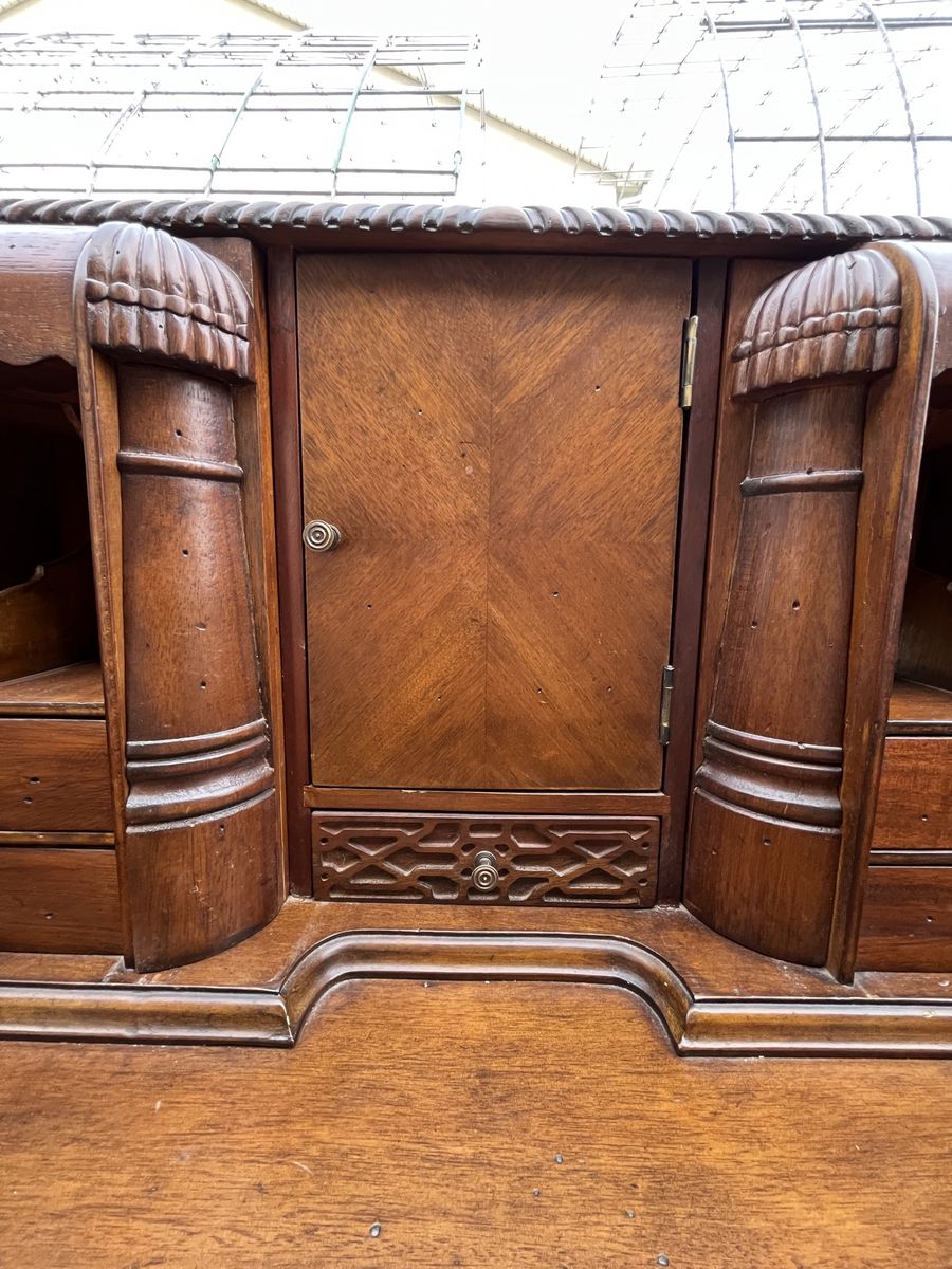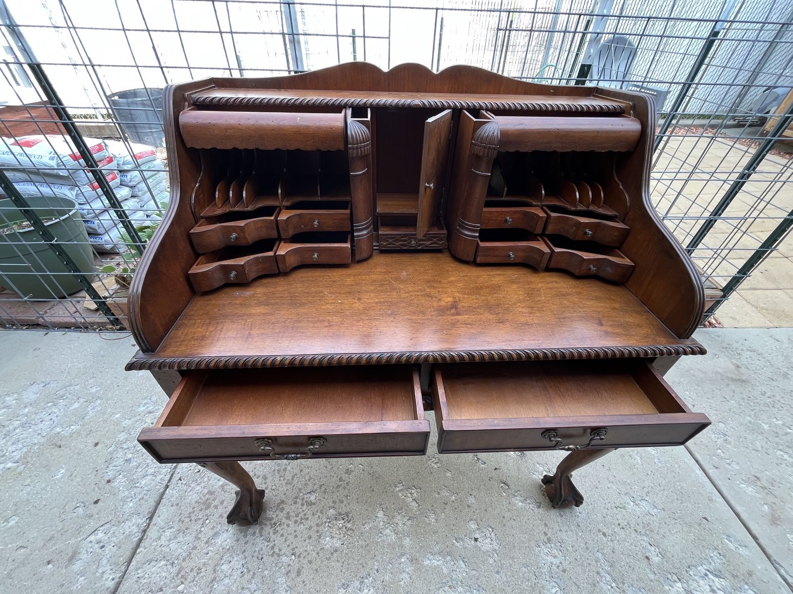 Solid wood desk in good condition with some wear. (See photos) Claw & ball feet Multiple small drawers and mall slots Decorative inlay on writing surface Upper gallery with carved detail