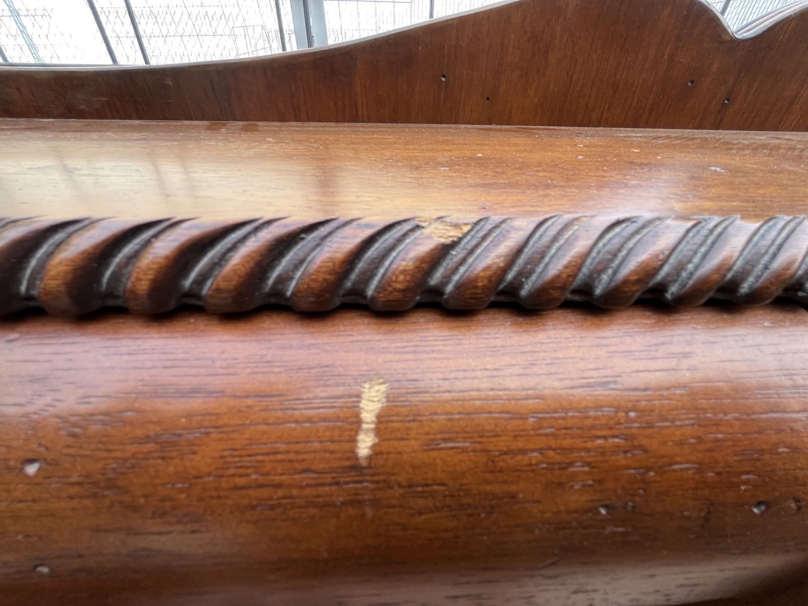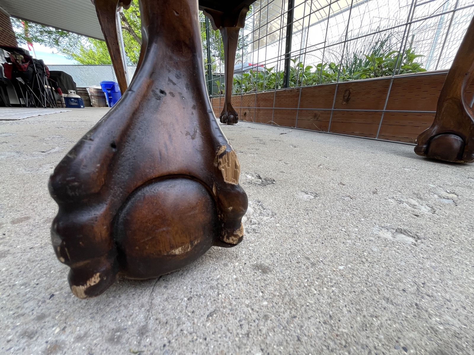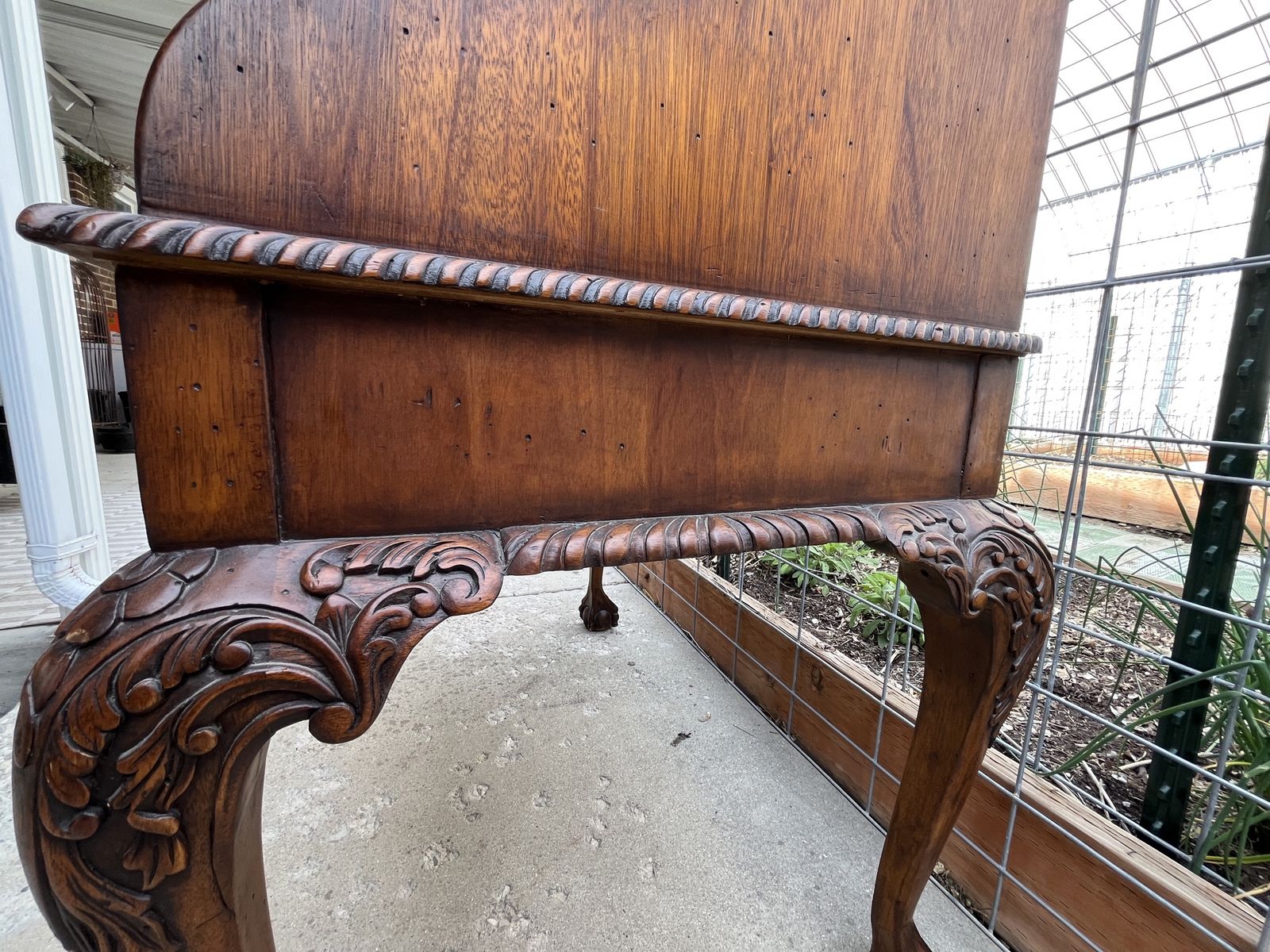 Solid wood desk in good condition with some wear. (See photos) Claw & ball feet Multiple small drawers and mall slots Decorative inlay on writing surface Upper gallery with carved detail