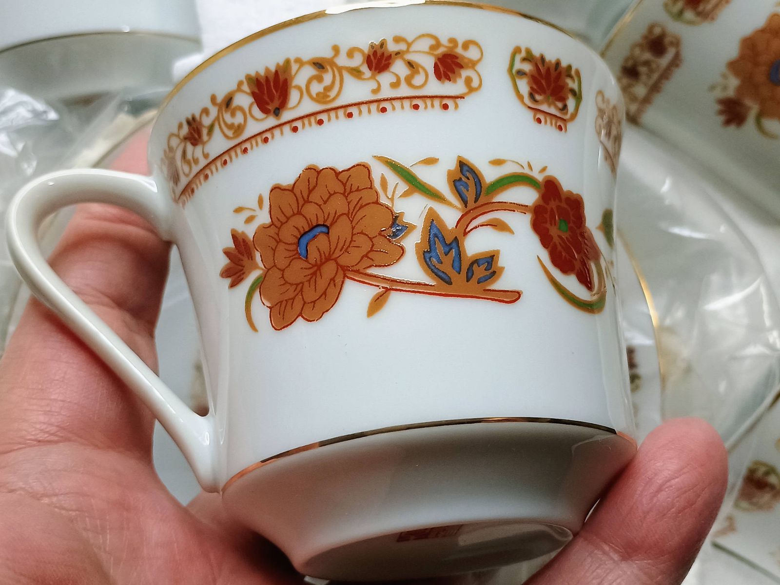 Here is a 12 piece coffee cup and saucer set from Tatung Taiwan. Gold trim with red floral design. vintage new in box.