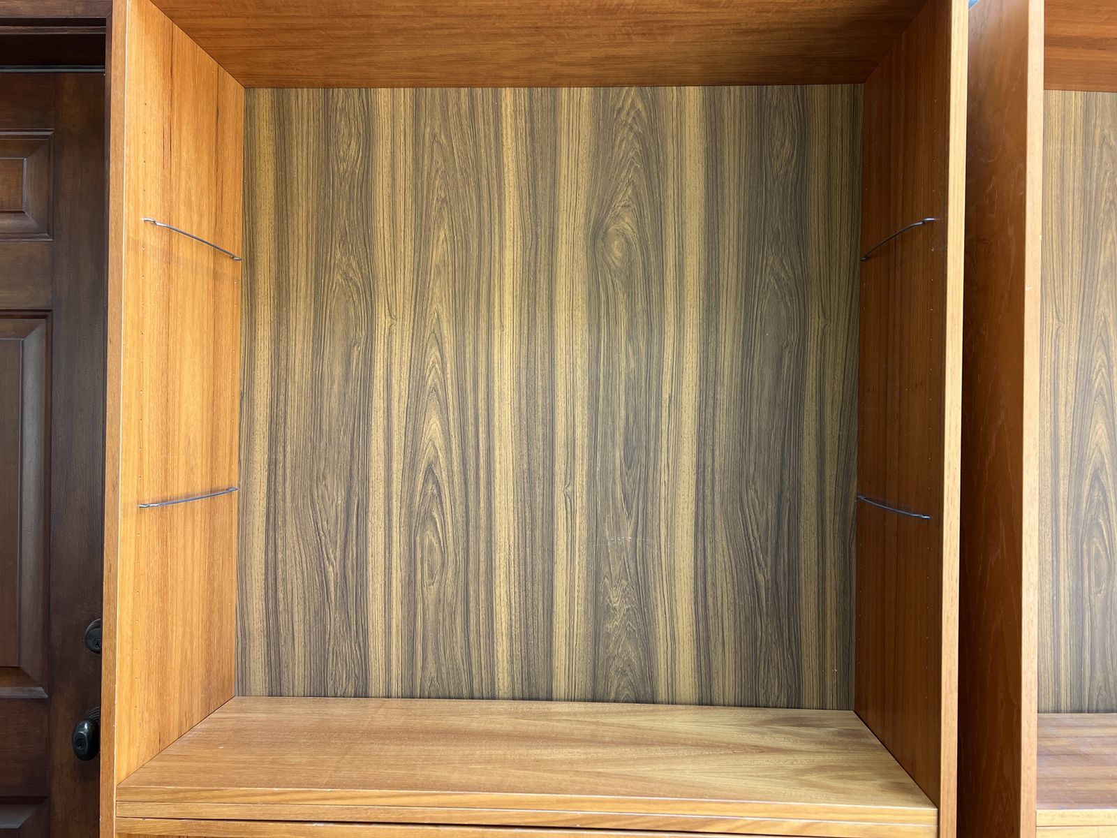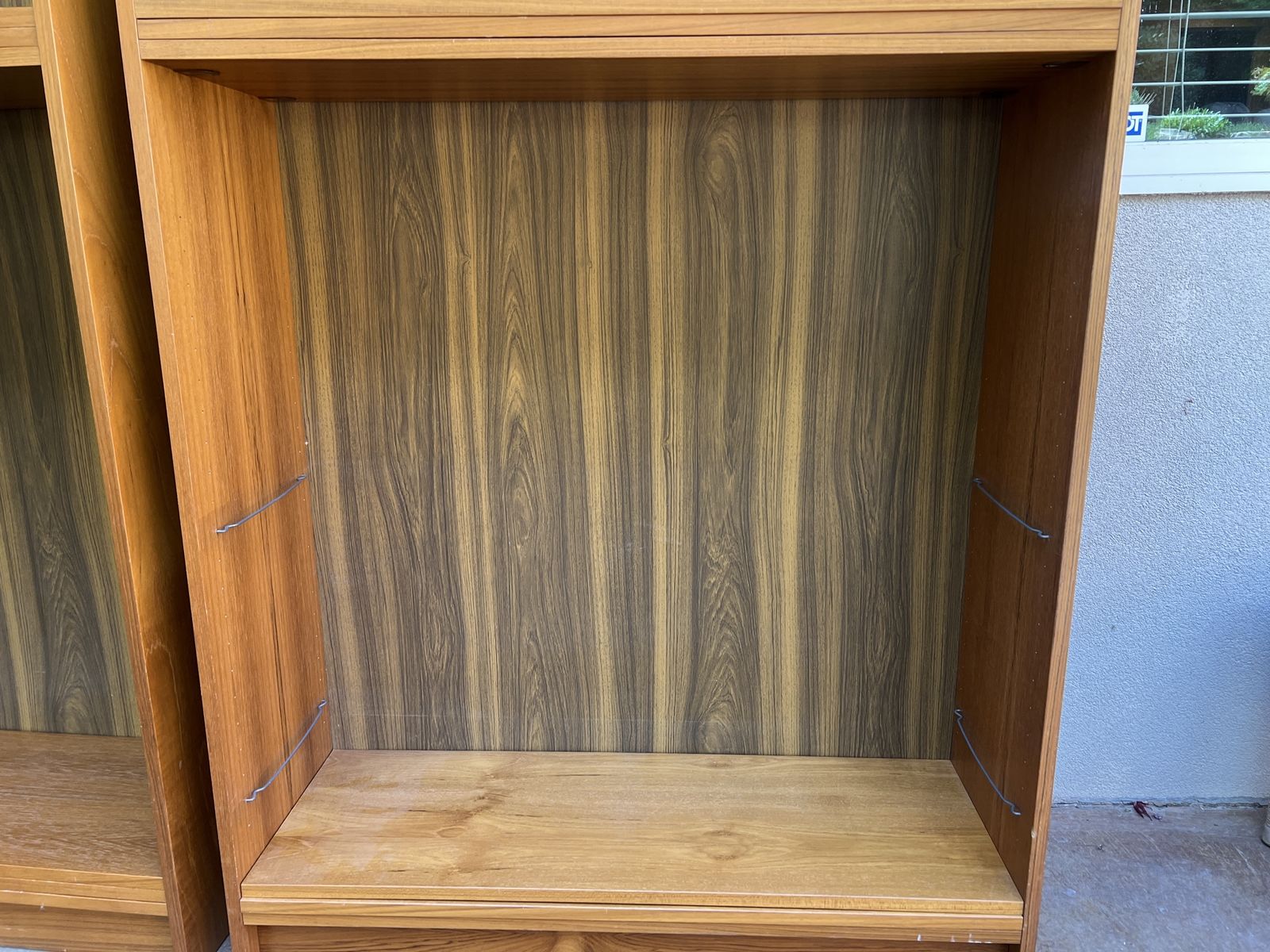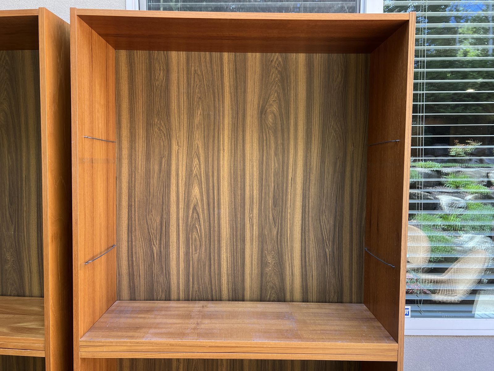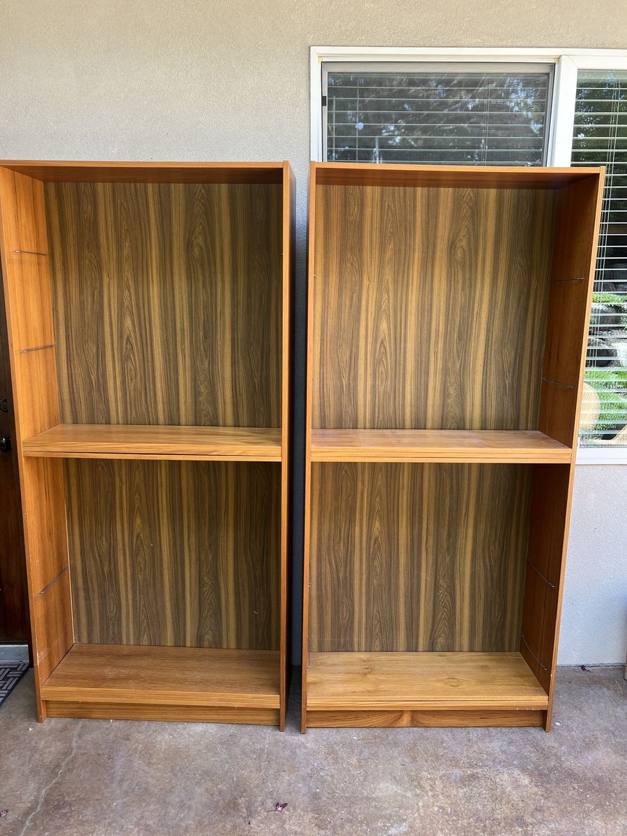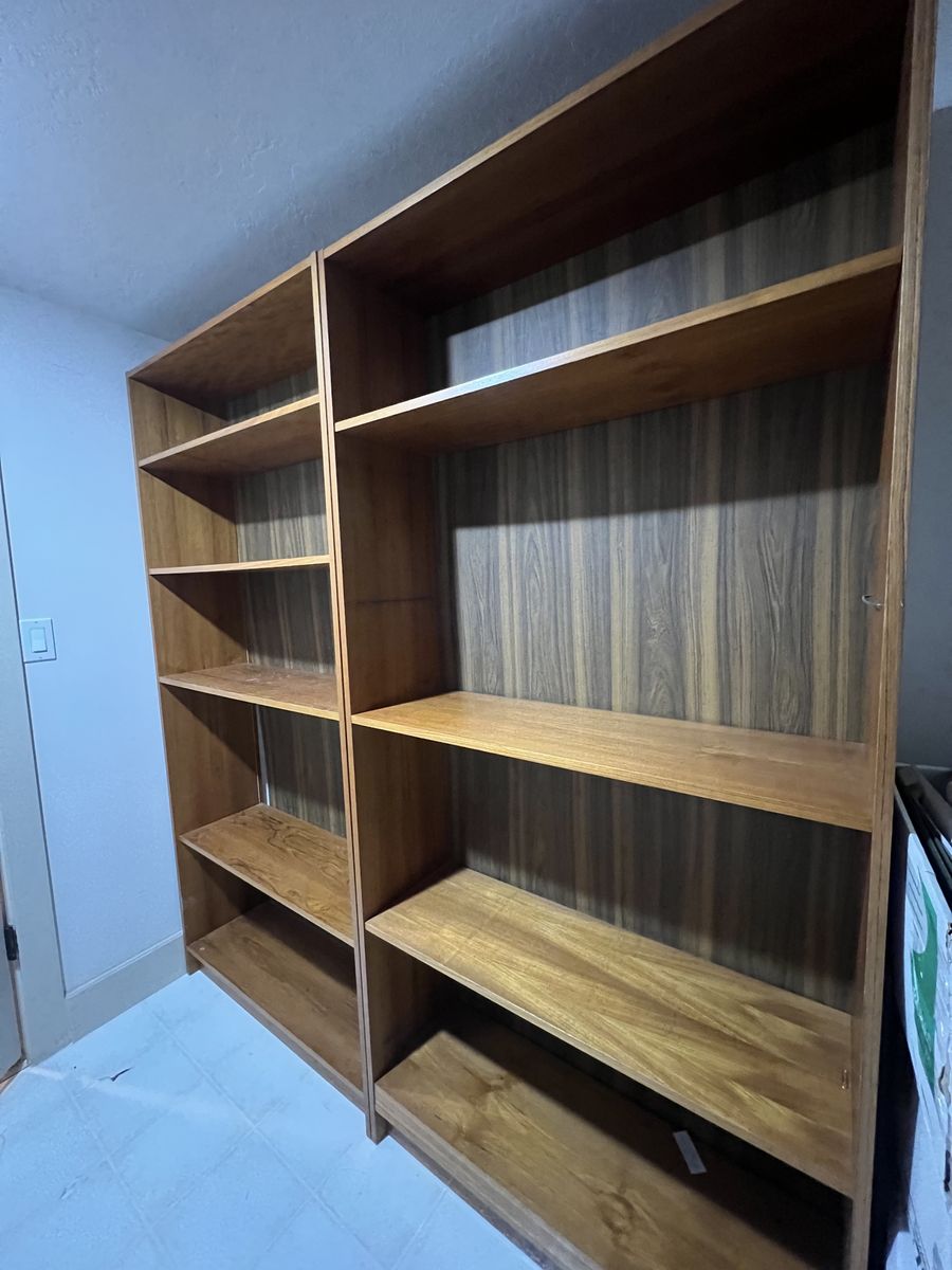 Venmo2 teak veneer bookcases with 4 adjustable shelves and 2 fixed shelves each. Sold as a set. Dimensions: H: 76in, W: 35.5in, D: 12in.