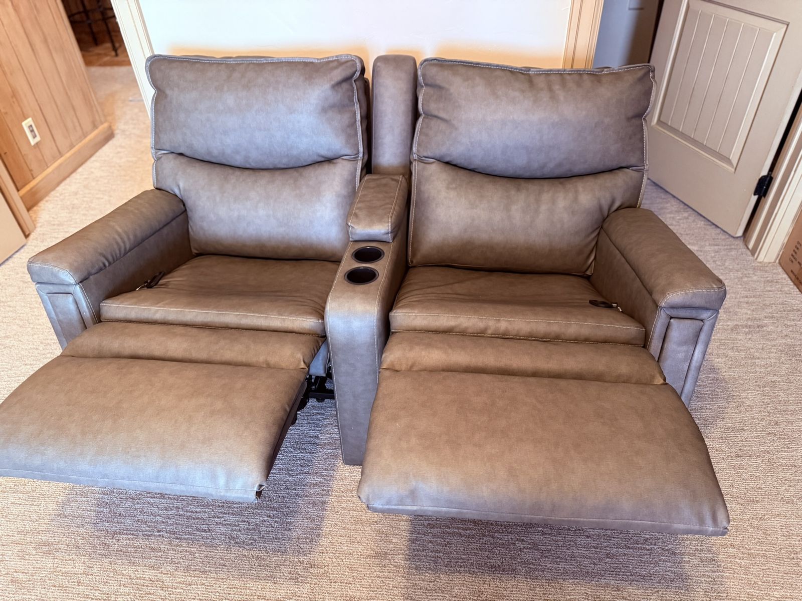 PayPalUsed, excellent condition manual RV recliners. There are no tears and/or rips in the furniture. Came out of a 2022 Grand Design RV. Each recliner has a manual pull for reclining position. the center console has two cup holders and small storage area for remotes, etc. These are synthetic leather that is easy to clean and resistant to spills.