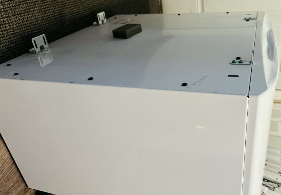 White Electrolux pedestal for washer or dryer. Clean, sturdy, and functional. Great way to add height and storage to your laundry room.