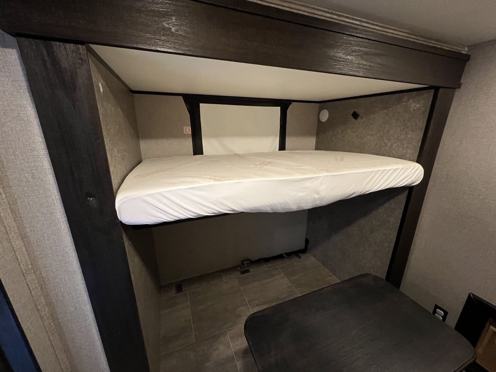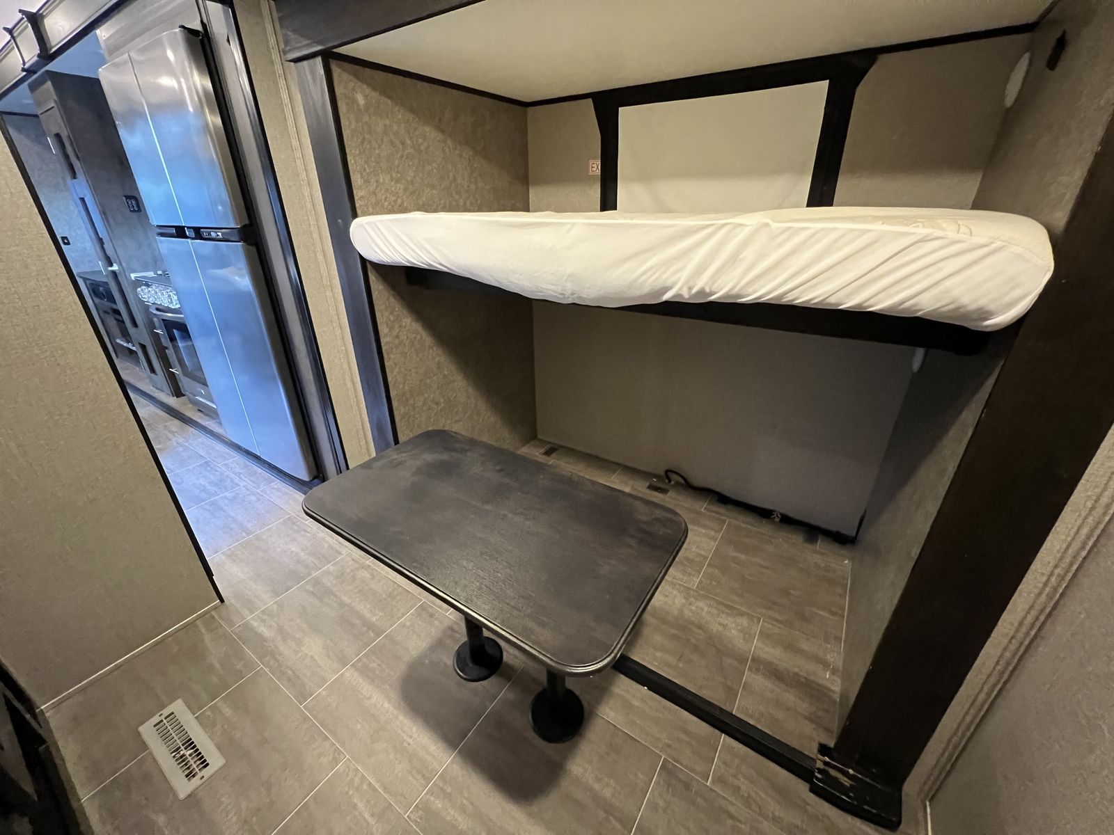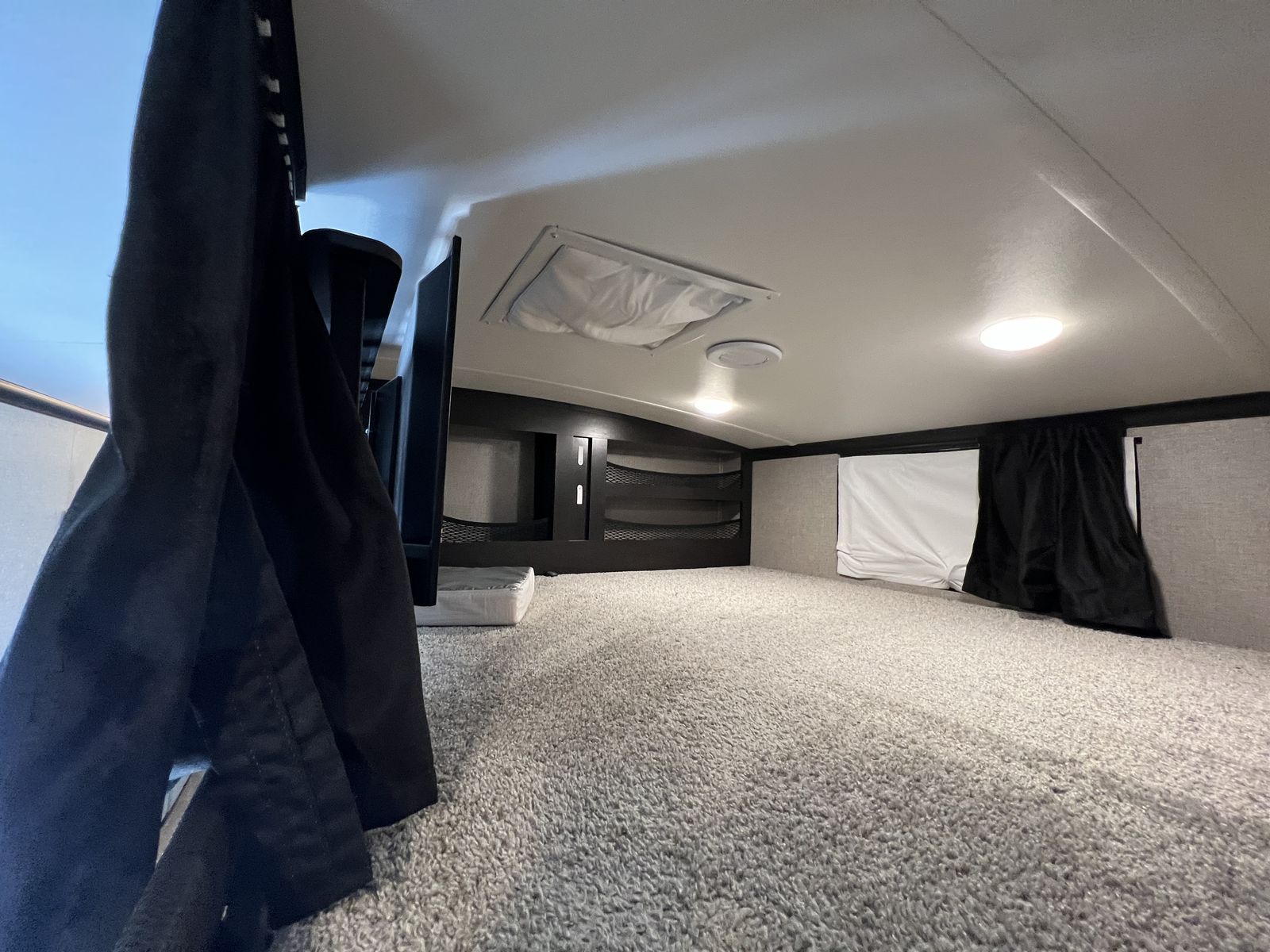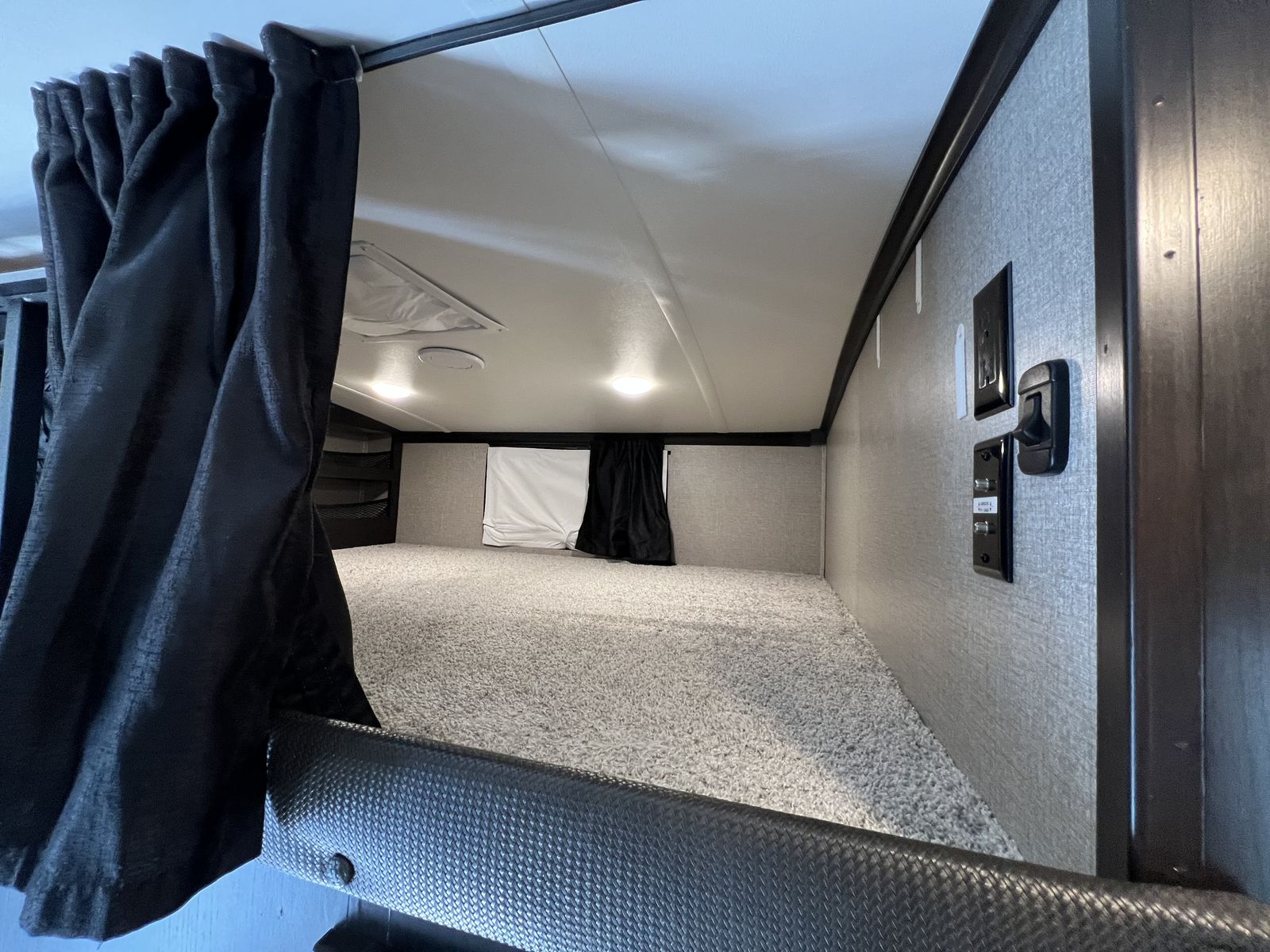 Layout: Mid-bunk room + overhead loft + rear living area with theater seating.