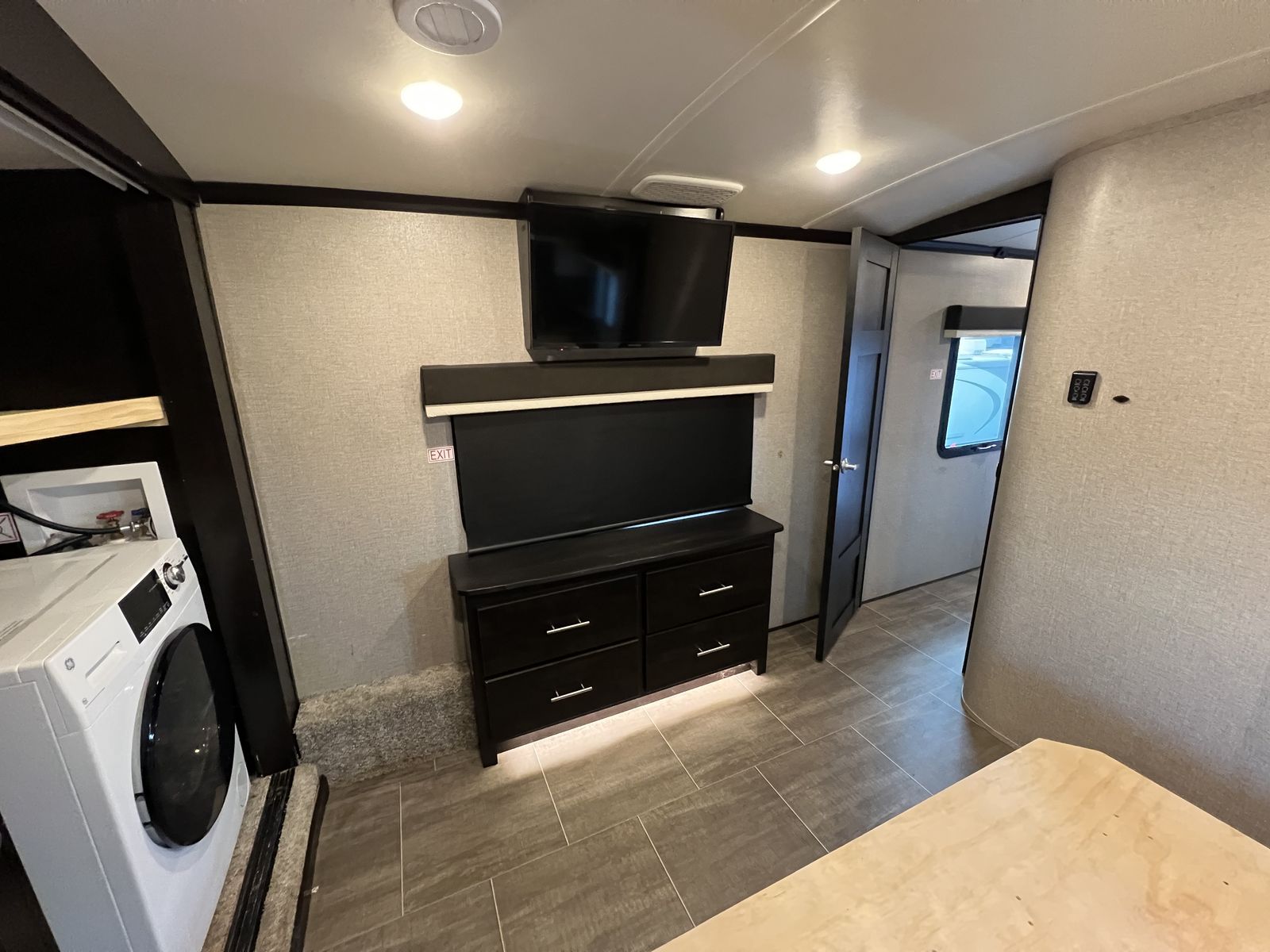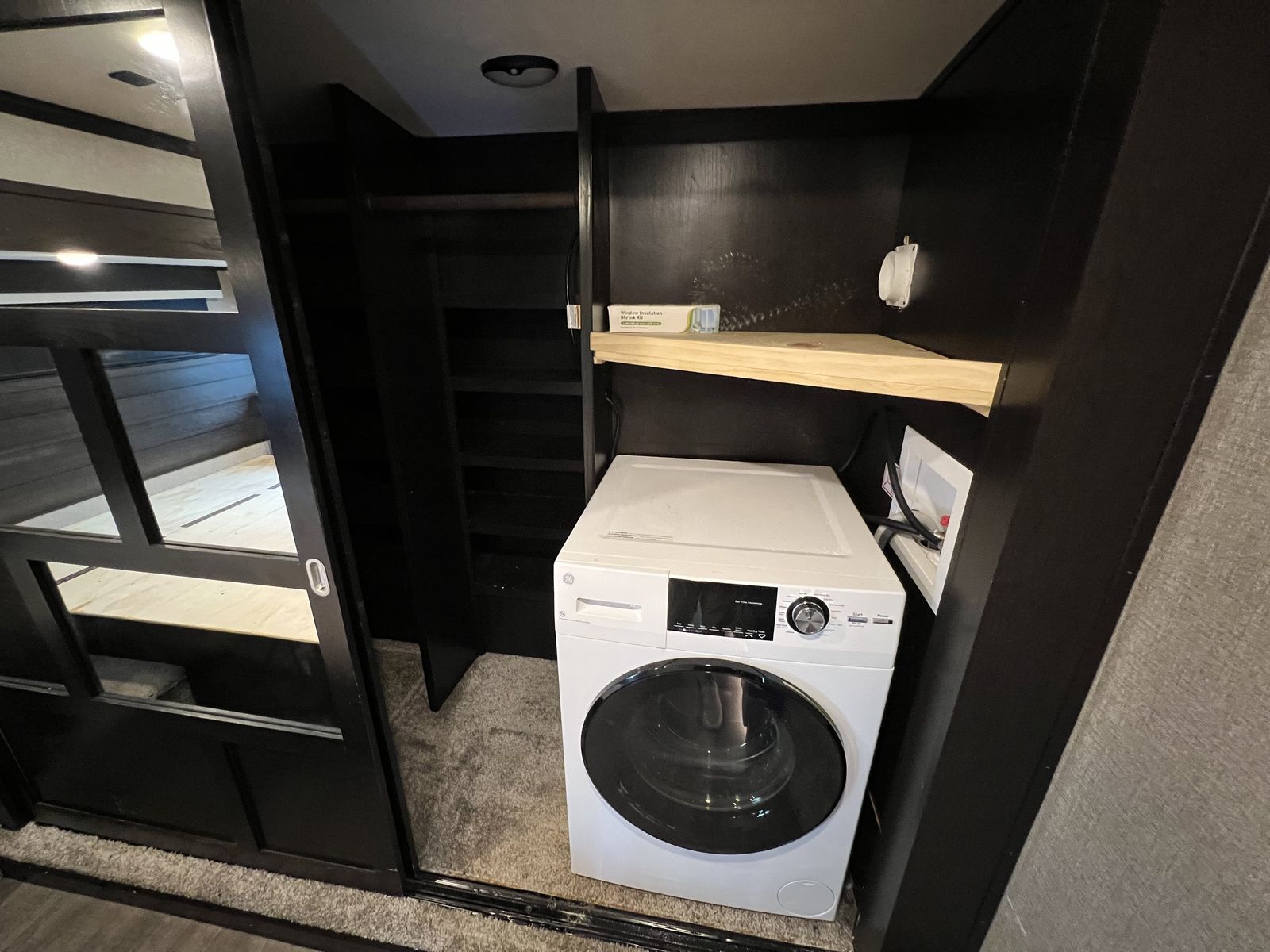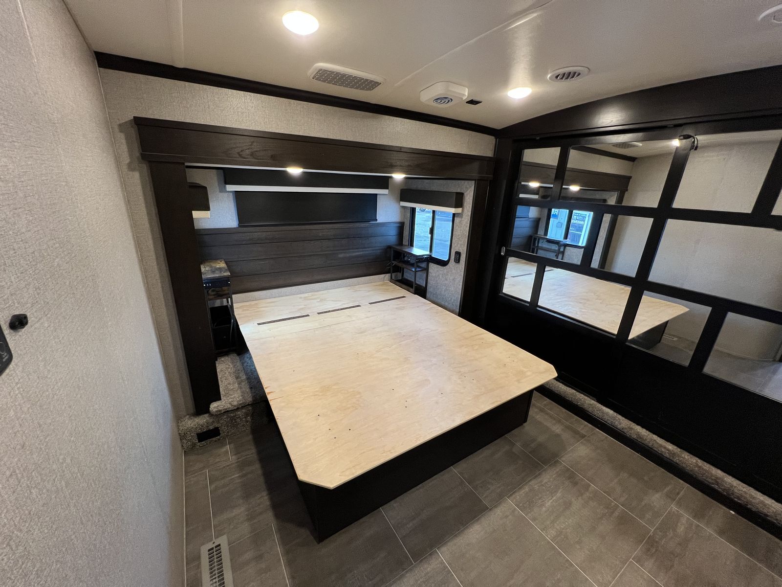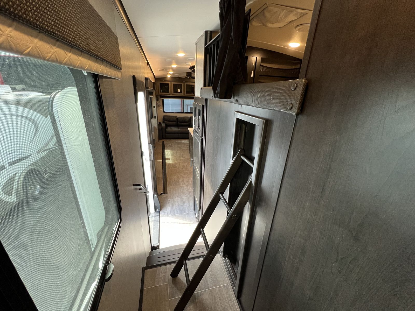 Layout: Mid-bunk room + overhead loft + rear living area with theater seating.