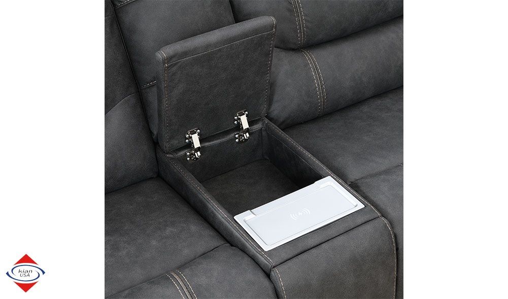 ApplePayPower Motion Sectional with 3 power seats. Stainless steel cupholder in each arm. Wireless charger on console. USB input on each end. Measurements: Length: 9x10 Depth: 39 inches Height: 42 inches