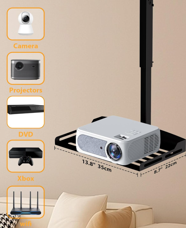 ZelleUniversal Compatibility & High Weight Capacity: Supports most projectors—including models without mounting holes—as well as cameras, laptops, and other AV equipment. The sturdy 13.8" x 8.7" metal tray safely holds up to 11 lbs, making it ideal for home theaters, offices, and studio setups.