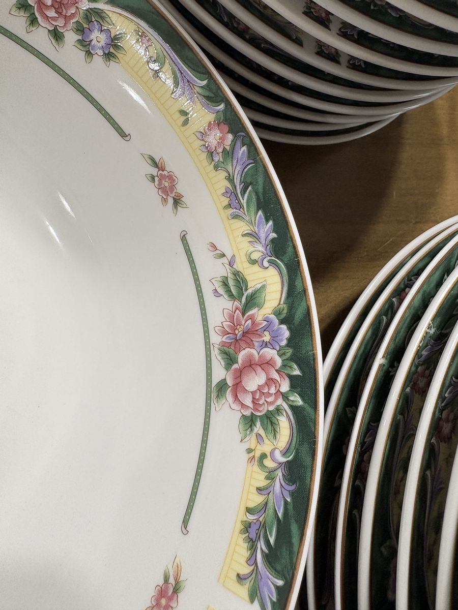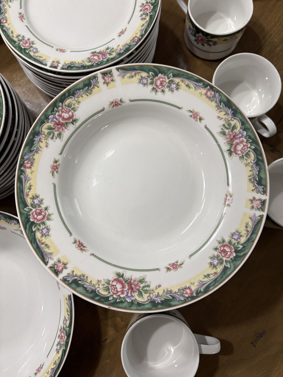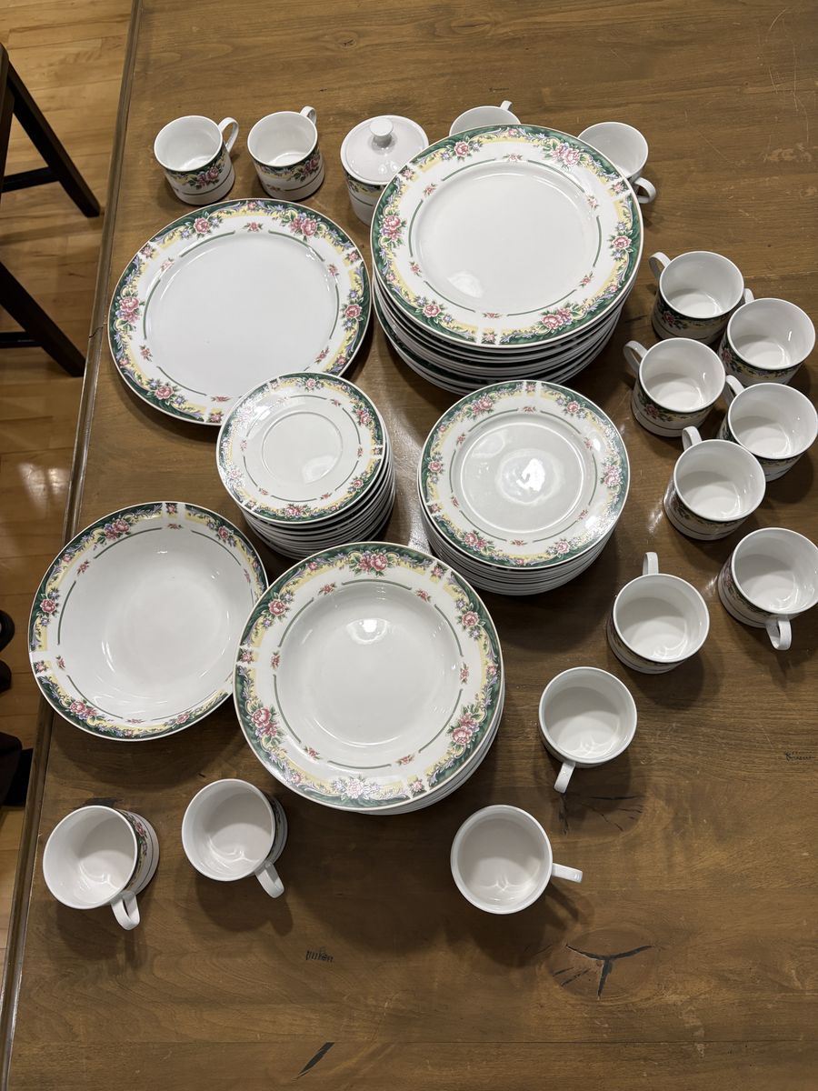 15 cups, 12 saucers, 12 small plates, 12 large plates, 12 bowls, 1 large plate, 1 large bowl , sugar dish
